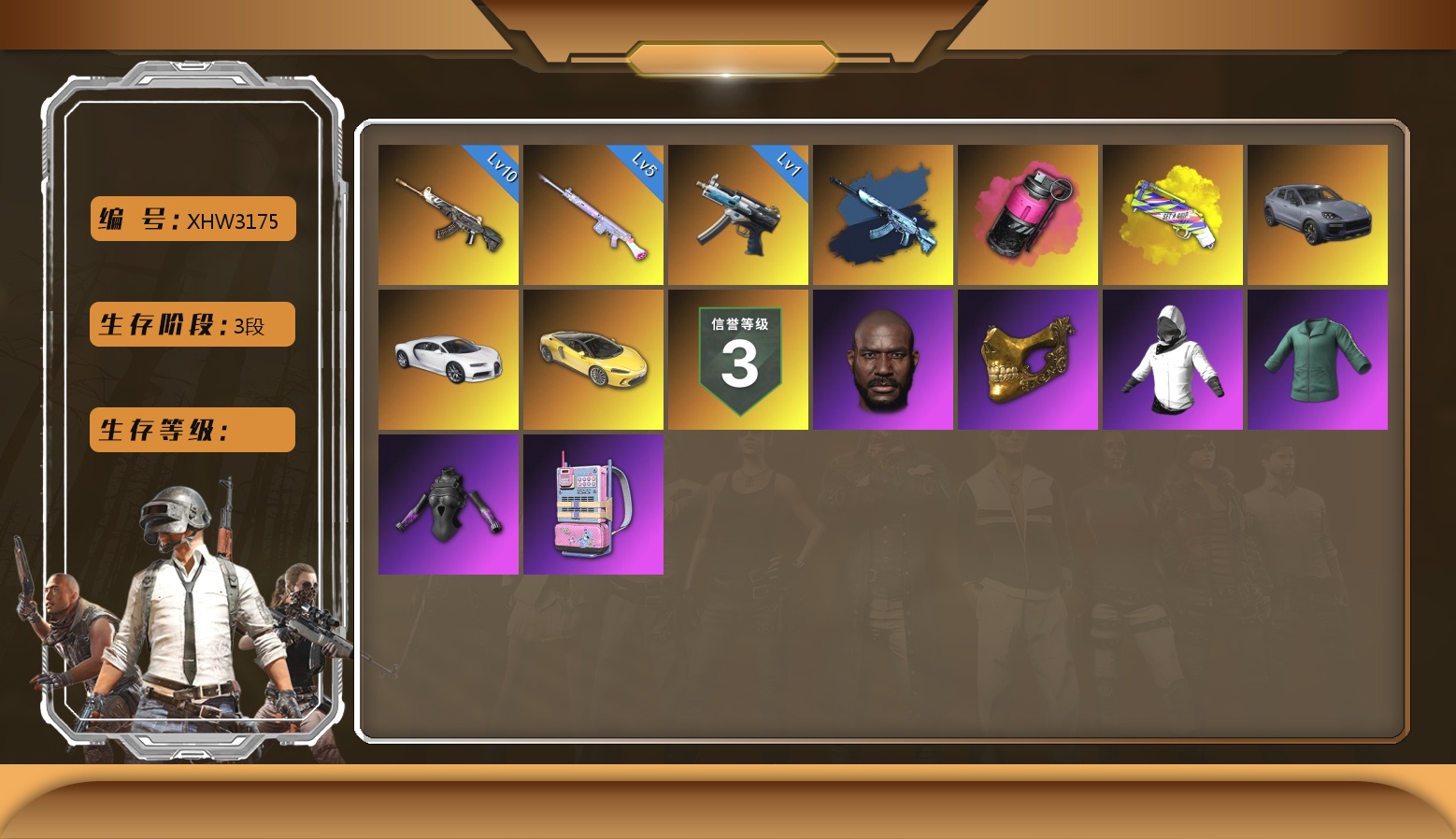 XHW3175 三阶段 信誉三级 【3色车漆 布加迪 卡宴】 10-5-1 10级恶魔ACE带异色 5级玩偶炮 1级无重力 红烟 黑鬼 金面 电磁背包 白战神 绿东 发光手臂 星魂白运动 小熊背包 胜利之舞145