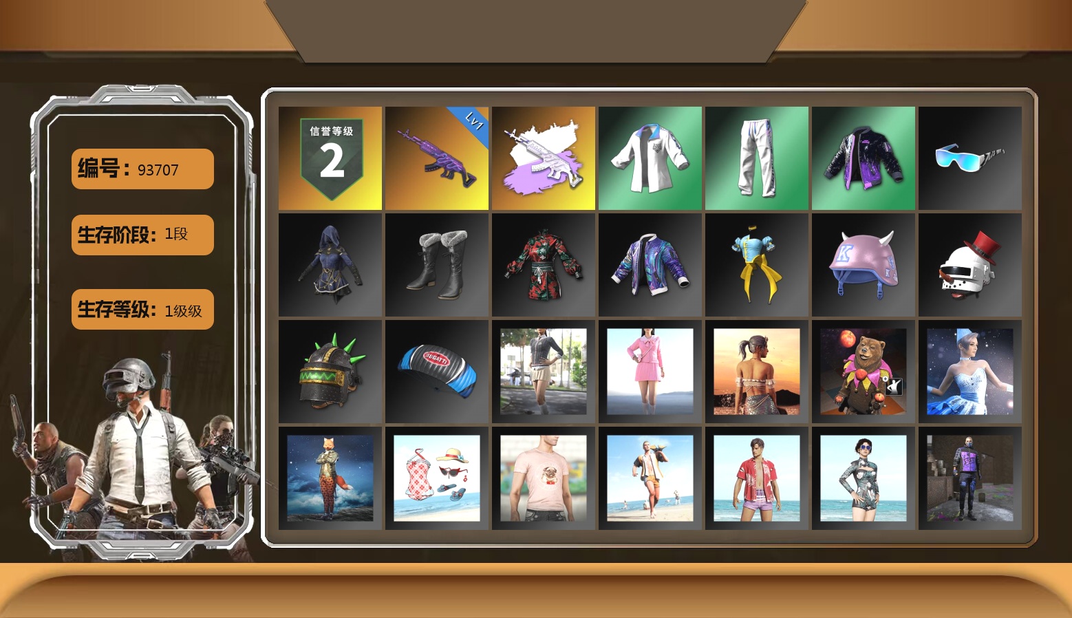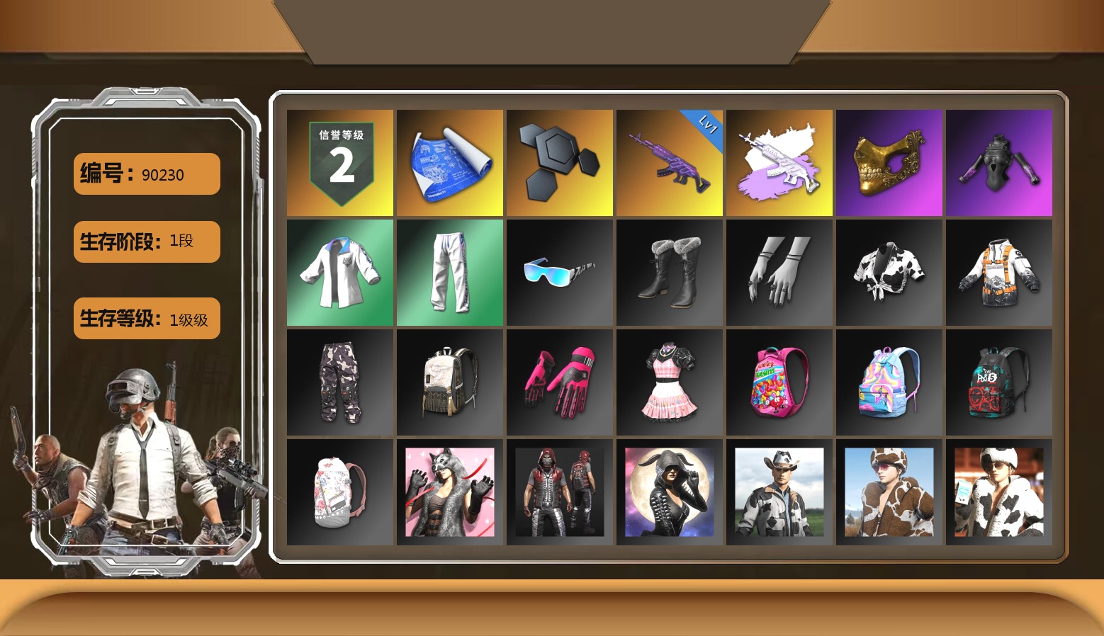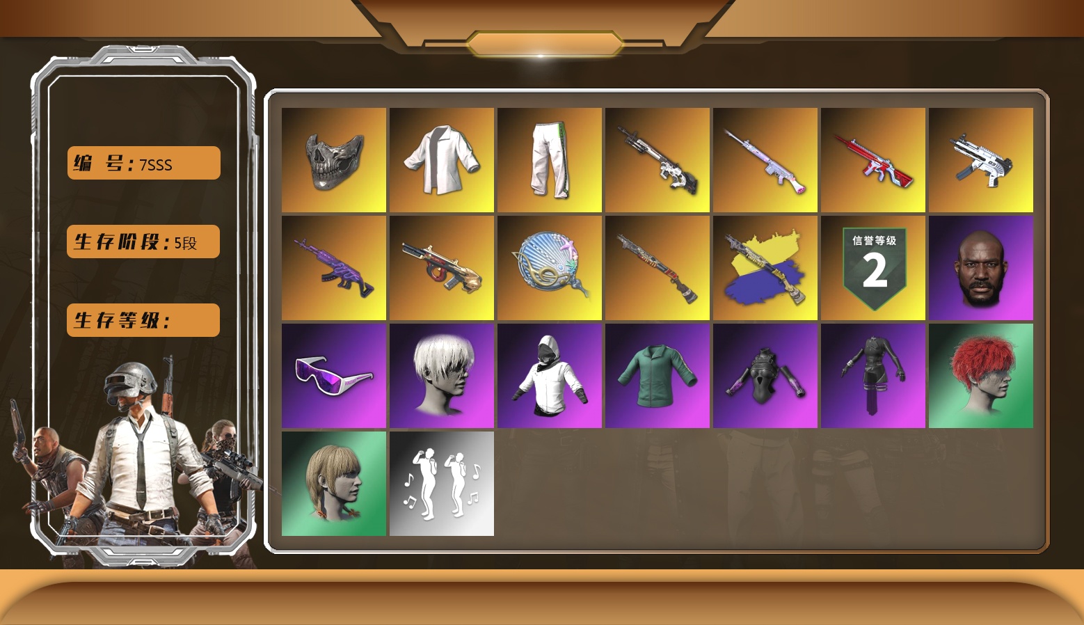 10级霓虹AUG 10级青龙762 10级孙悟空M24 8级火麒麟 8级恶魔ACE 8级齿轮炮 7级圣诞mini 5级南瓜M4 4级沙悟净MINI 4级刻耳柏洛斯M249 3级烈日灼烧-S1897 2级唐三藏平底锅 1级赛博MK12 1级DBS 1级德拉贡 1级无信号M4 1级无重力MP5K 1级塞壬平底锅 青龙762(异色) 恶魔ACE(异色) 紫色烟雾弹 天蓝色烟雾弹 橙色狂怒之雾-M79 湛蓝狂怒之雾-M79 柏林鞋 黑绷带 跑车 马丁跑车 胜利密室 交易所接待室 青蛙大炮 玩具AK 马东锡 内马尔 黑鬼 金面 渔夫帽 红面巾 黑大衣 白战神 小战神 发光手臂 竞猜裤 白熊鞋 萨芬裤 青蛙套 橙运动 拉风龙 车漆 小马尾 小绿头 西游记 脏辫 小兔学院 街头霸王 绷带AK 嘉米-加农钉 哎呀!抱歉 枪炮洗礼