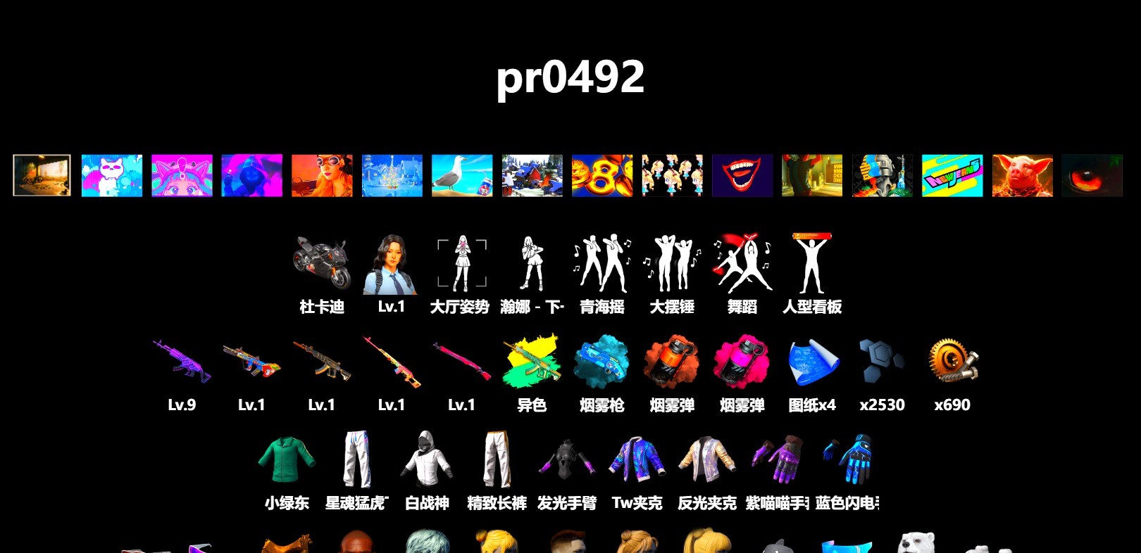 9级美杜莎762 黑绷带 保时捷911 马丁跑车 交易所接待室 黑鬼 金面 牛角 小战神 活动绿东 发光手臂 白熊鞋 拉风龙 鸡斯卡夹克 丸子头 西游记 小兔学院 枪炮洗礼