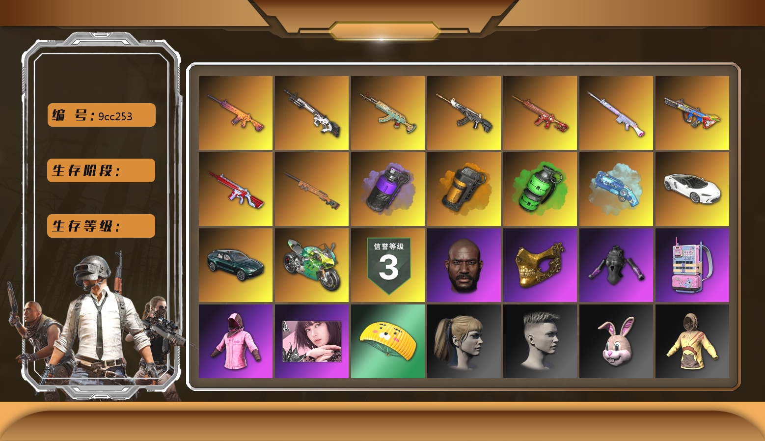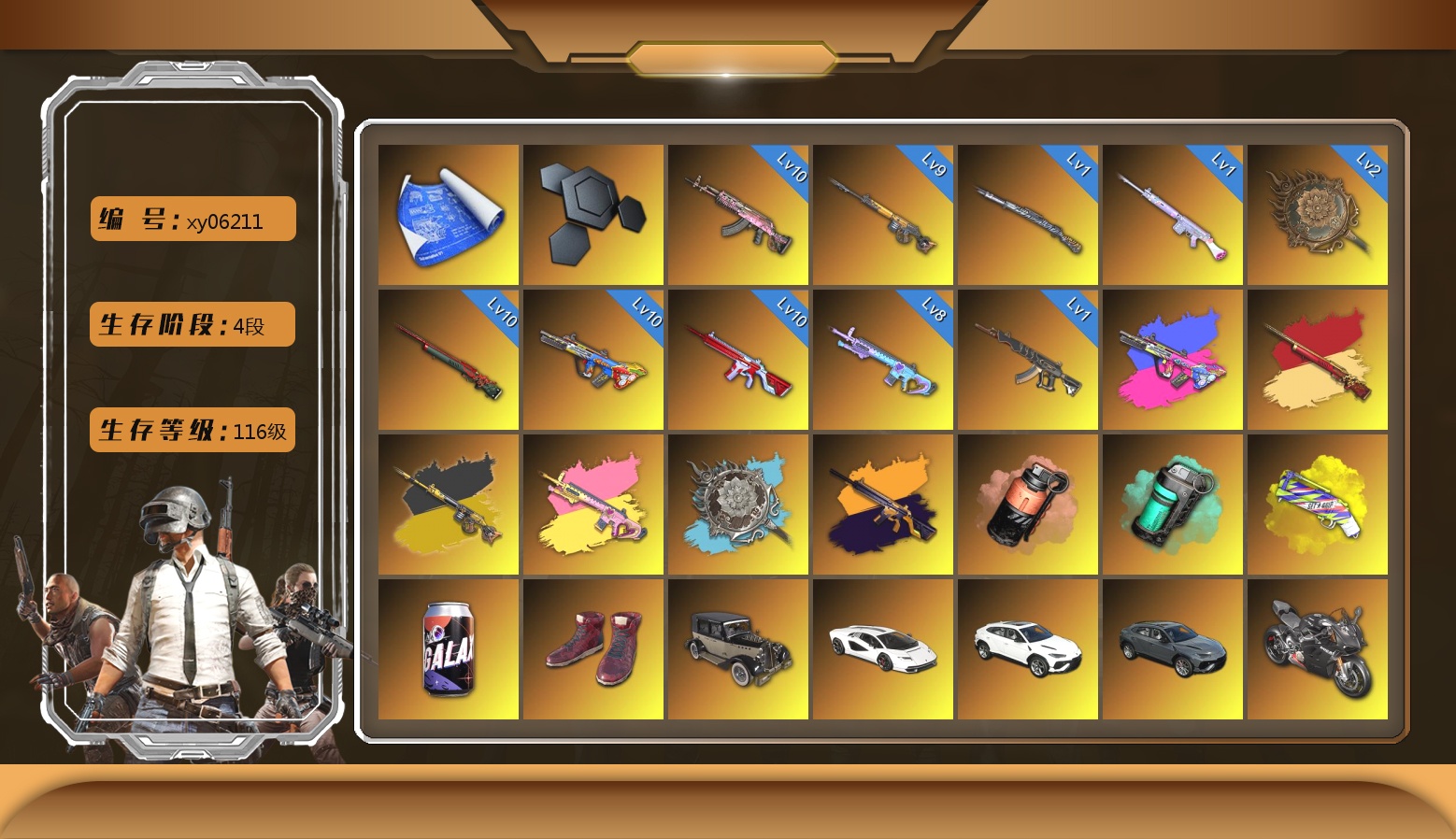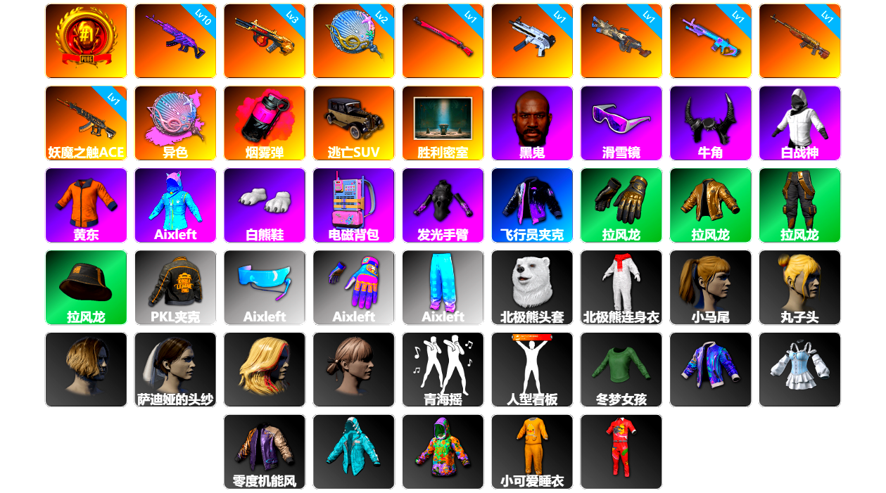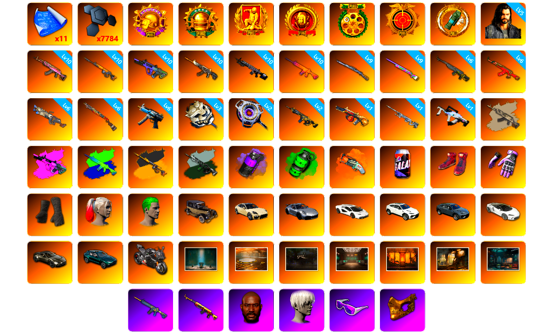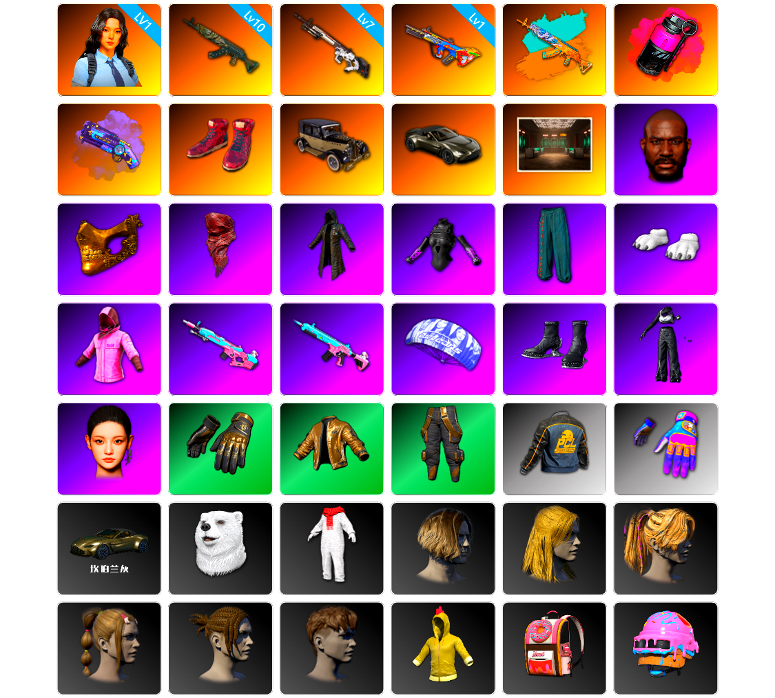 11张图纸 7784聚合物 收割者金标 5级多利安 10级火麒麟 10级齿轮炮 10级霓虹AUG 10级恶魔ACE 10级暗影之主Mk12 10级南瓜M4 9级猛虎98k 9级彩虹M24 6级玄武SKS 6级圣诞AK 6级刻耳柏洛斯M249 6级烈日灼烧-S1897 6级寒蚀MP5K 3级白虎锅 2级虚空使者 2级时空使者M4 1级弥诺陶洛斯AUG 1级幽影残魂AWM 1级冰域Groza 火麒麟(异色) 霓虹AUG(异色) 南瓜M4(异色) 齿轮炮(异色) 时空使者M4(异色) 紫色烟雾弹 翡翠色烟雾弹 橙色狂怒之雾-M79 柏林鞋 小黑盒 黑绷带 小丑女 小丑男 帕拉梅拉 保时捷911 兰博基尼跑车 兰博基尼SUV 兰博基尼奢华版 迈凯伦硅质白版 马丁跑车 马丁SUV 杜卡迪纯净黑 胜利密室 陈列室 兰博大厅 交易所接待室 武器神龛 黑鬼 9s发型 滑雪镜 金面 渔夫帽 牛角 丑男妆容 橙色发带 红面巾 黑大衣 白战神 小战神 黄东 发光手臂 萨芬裤 白熊鞋 橙运动 监狱服 渐变装 粉战神 女团 阿狸 小黄鸭 尼尔 布朗熊 拉风龙 鸡斯卡夹克 车漆 小马尾 粉头 丸子头 西游记 脏辫 爱的主打歌 小兔学院 悲喜 绷带AK PGC 2021套装 胜利之舞39