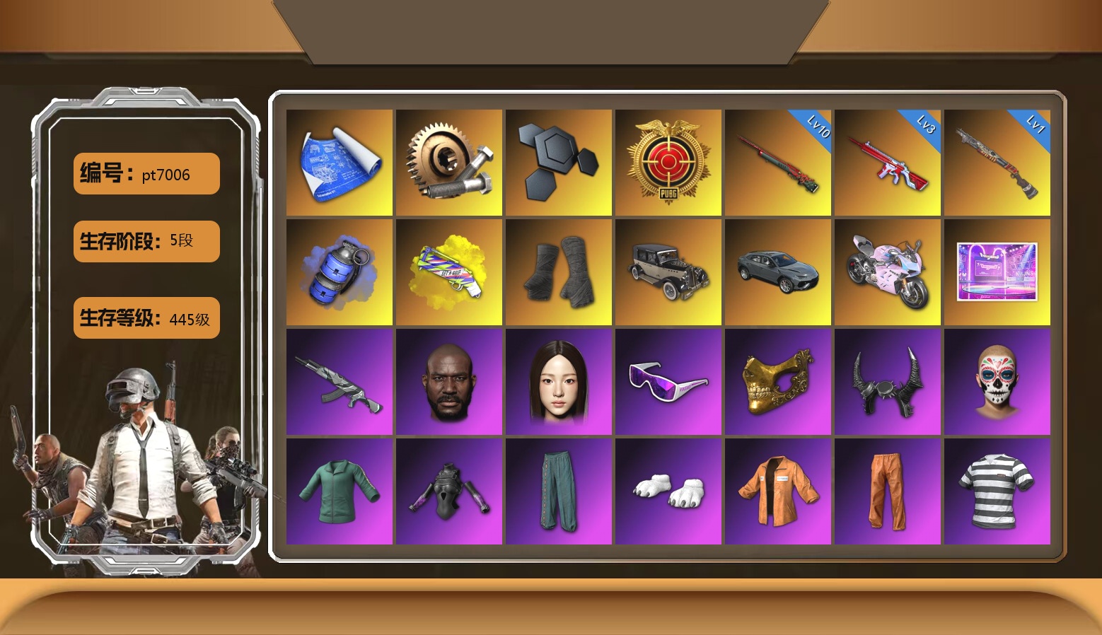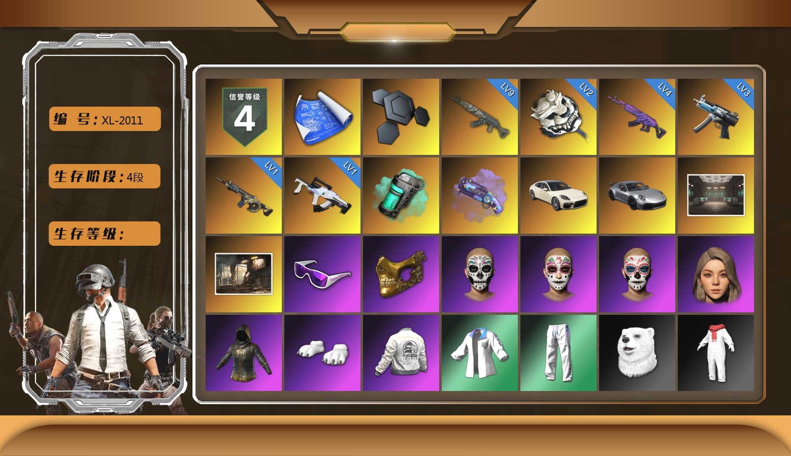 9级青龙762 4级美杜莎762 3级寒蚀MP5K 2级白虎锅 1级时空使者M4 级冰域Groza 青色烟雾弹 紫色魔法迷雾-M79 帕拉梅拉 保时捷911 交易所接待室 5张图纸 2240聚合物 滑雪镜 金面 白熊鞋 滑雪帽 小马尾 西游记 青海摇 小兔学院 绷带AK 枪炮洗礼
