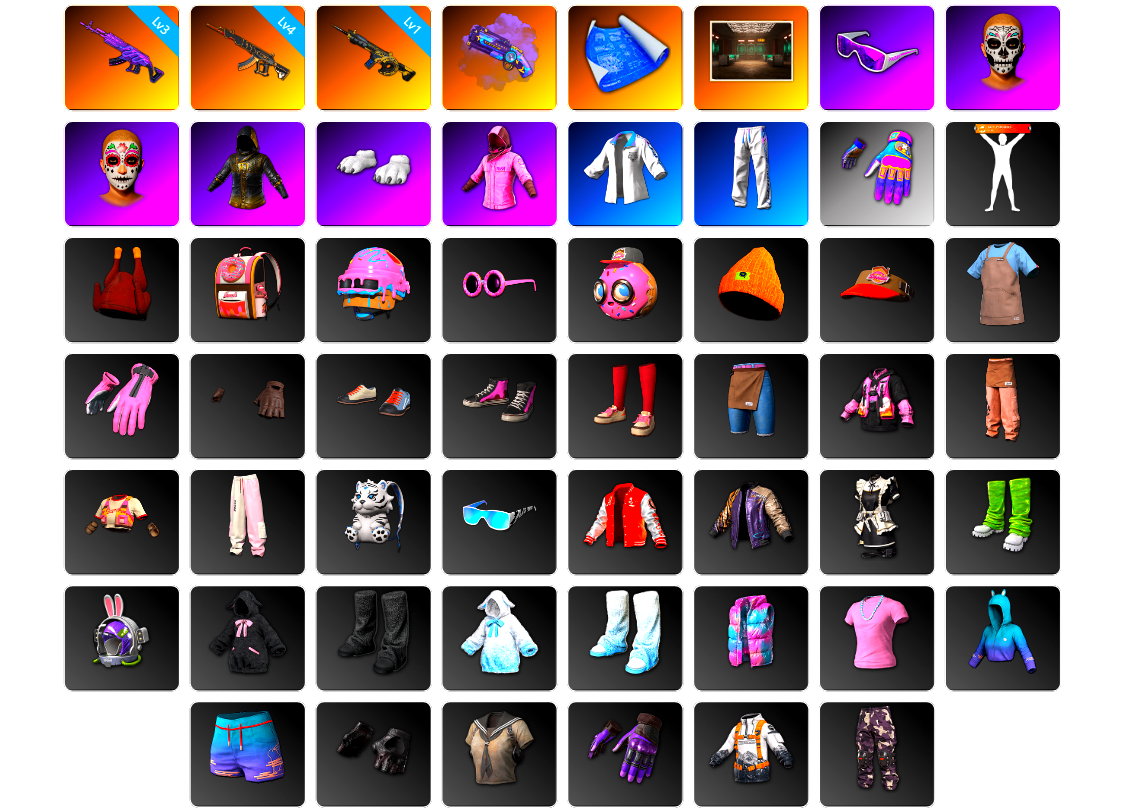 收割者金标 柏林面具 柏林裤 红东 金叶手套 迈阿密 小兔手套 小黑盒 玩具手套 10级火麒麟 10级霓虹AUG 8级齿轮炮 6级恶魔ACE 6级沙悟净MINI 6级孙悟空M24 3级南瓜M4 2级烈日灼烧-S1897 2级塞壬平底锅 恶魔ACE(异色) 紫色烟雾弹 翡翠色烟雾弹 品红色烟雾弹 黄色狂怒之雾-M79 2张图纸 8460聚合物 蜗牛币 柏林鞋 黑绷带 白绷带 小丑女 小丑男 布加迪奢华版跑车 马丁跑车 马丁SUV 胜利密室 冬季藏匿处 交易所接待室 武器神龛 粉猪M4 玩具AK 黑鬼 滑雪镜 金面 牛角 康萨斯 卡崔娜 马东锡 橙色发带 红面巾 黑大衣 小战神 活动绿东 发光手臂 竞猜裤 电磁背包 白熊鞋 雷蛇 橙运动 监狱服 渐变装 女团 小黄鸭 可可 鸡斯卡夹克 车漆 小马尾 粉头 丸子头 脏辫 小兔学院 悲喜 西游记 滑雪帽 胜利之舞39