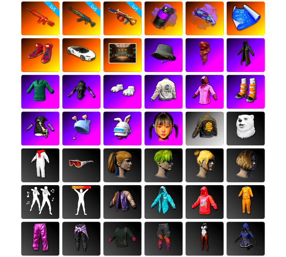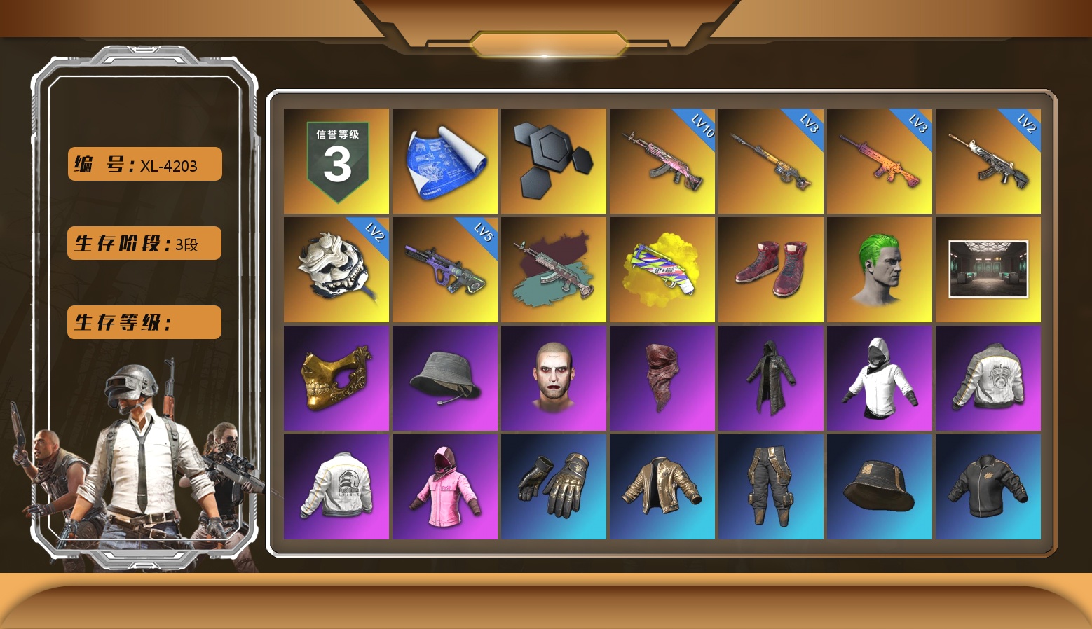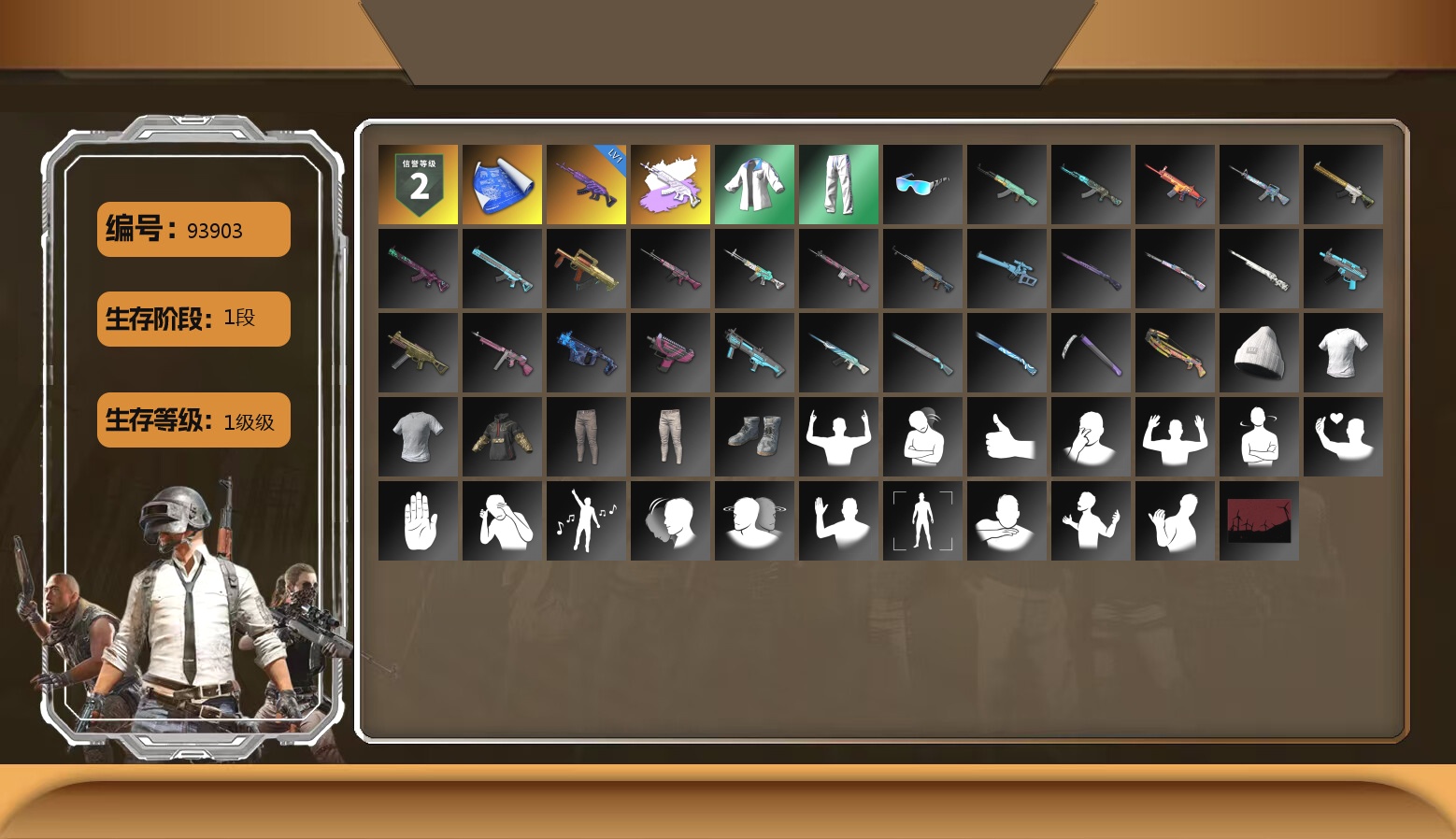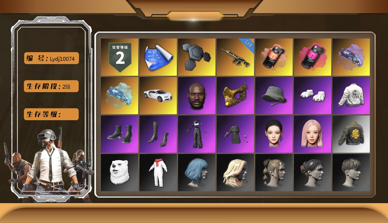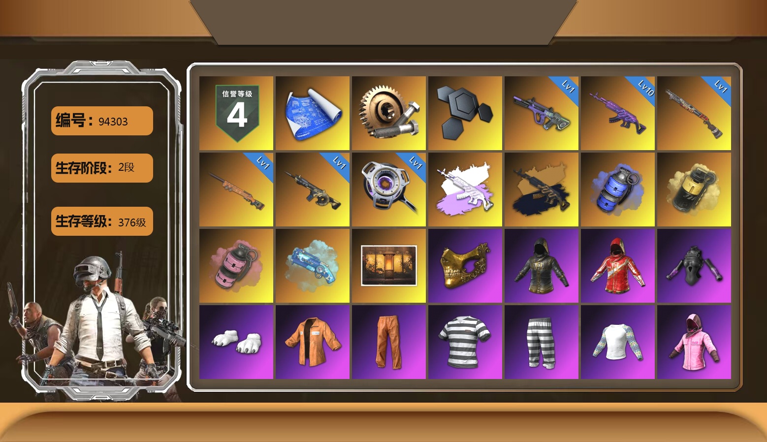 无信号M4 满级 烈日灼烧 满级 圣诞AK 满级 孙悟空M24 满级 美杜莎762 满级 塞壬平底锅 2 玩偶炮 1 刻耳柏洛斯M249 1 阿斯顿马丁V12 迈凯伦 布加迪 保时捷911跑车 无信号异色 烈日灼烧异色 无信号M4(异色) 玩偶屋异色 孙悟空M24(异色) 魔咒之力Mk12 烟雾弹 带改名卡 拉风龙 小兔学院 小马尾 危险玩偶屋 金面 滑雪镜 黑鬼 发光手臂 马东锡 小兔手套