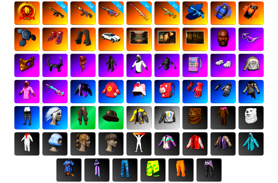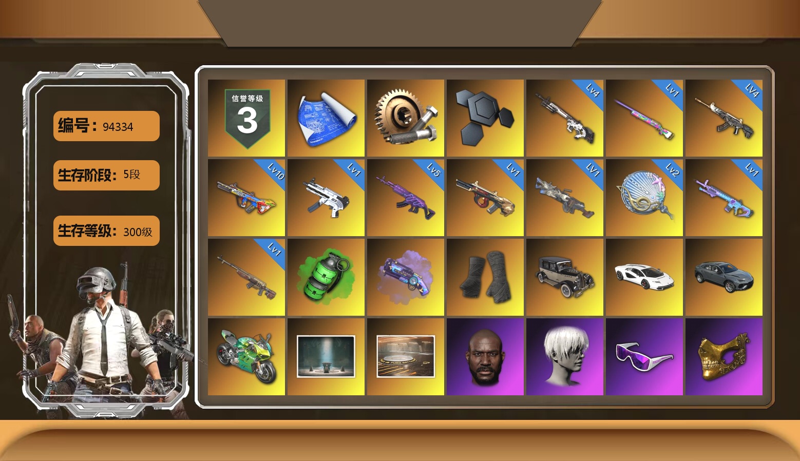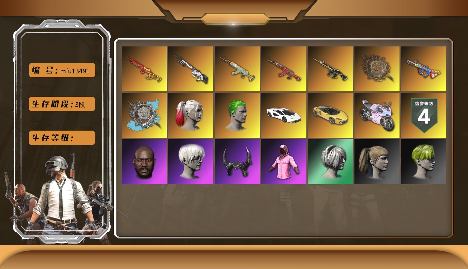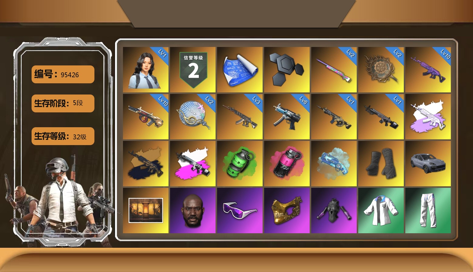 9级恶魔ACE 8级彩虹M24 2级无信号M4 2级塞壬平底锅 1级水麒麟 1级德拉贡 1级弥诺陶洛斯AUG 1级烈日灼烧-S1897 1级GD-AUG S1897(异色) 品红色烟雾弹 黄色狂怒之雾-M79 保时捷卡宴 武器神龛 3张图纸 2531聚合物 9s发型 金面 牛角 白战神 黄东 活动绿东 发光手臂 白熊鞋 滑雪帽 尼尔 拉风龙 丸子头 脏辫 青海摇 小兔学院 绷带AK 胜利之舞39