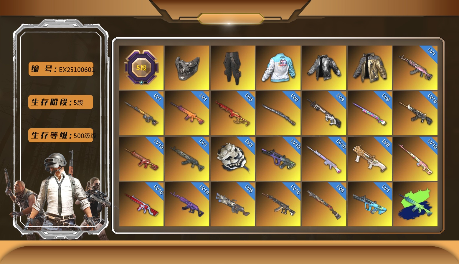 5级火麒麟 1级齿轮炮 1级DBS 1级圣诞AK 1级孙悟空M24 1级爆裂AUG 1级德拉贡 1级魔咒之力Mk12 翡翠色烟雾弹 柏林鞋 交易所接待室 3张图纸 黑鬼 9s发型 金面 红面巾 黑大衣 粉战神 尼尔 拉风龙 小兔学院 悲喜 西游记