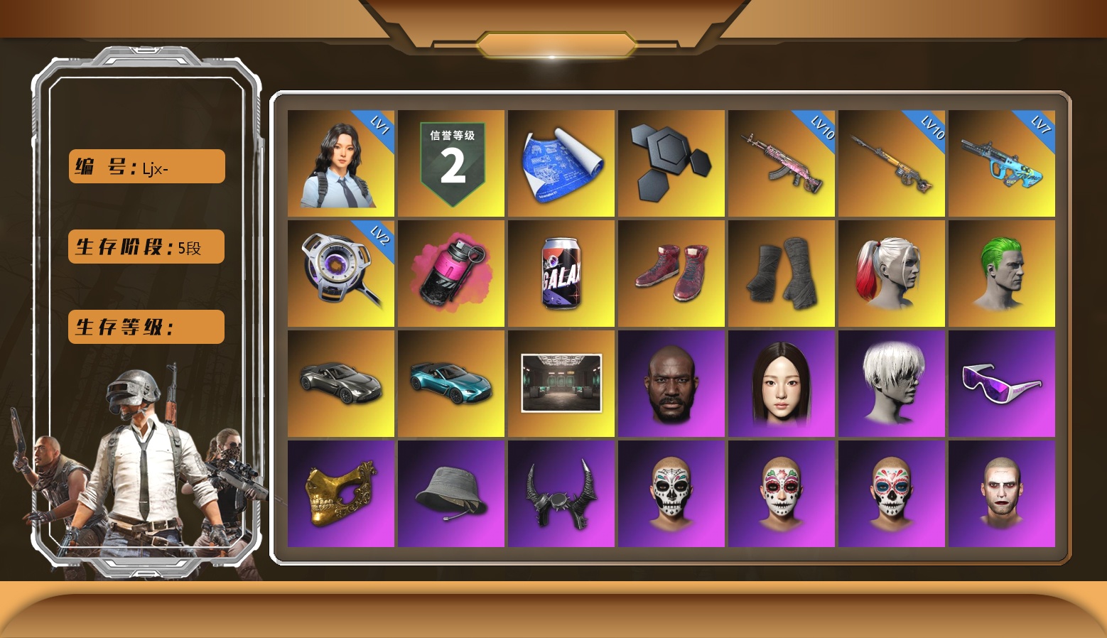 10级孙悟空M24 10级妖魔之触ACE 6级时光加农SKS 4级美杜莎762 3级塞壬平底锅 1级烈日灼烧-S1897 美杜莎(异色) 妖魔之触(异色) 蓝色烟雾弹 品红色烟雾弹 橙色狂怒之雾-M79 柏林鞋 帕拉梅拉 保时捷卡宴 布加迪跑车 胜利密室 6张图纸 2246聚合物 黑鬼 滑雪镜 金面 红面巾 黑大衣 白战神 活动绿东 发光手臂 白熊鞋 拉风龙 小马尾 西游记 脏辫 车漆 小兔学院