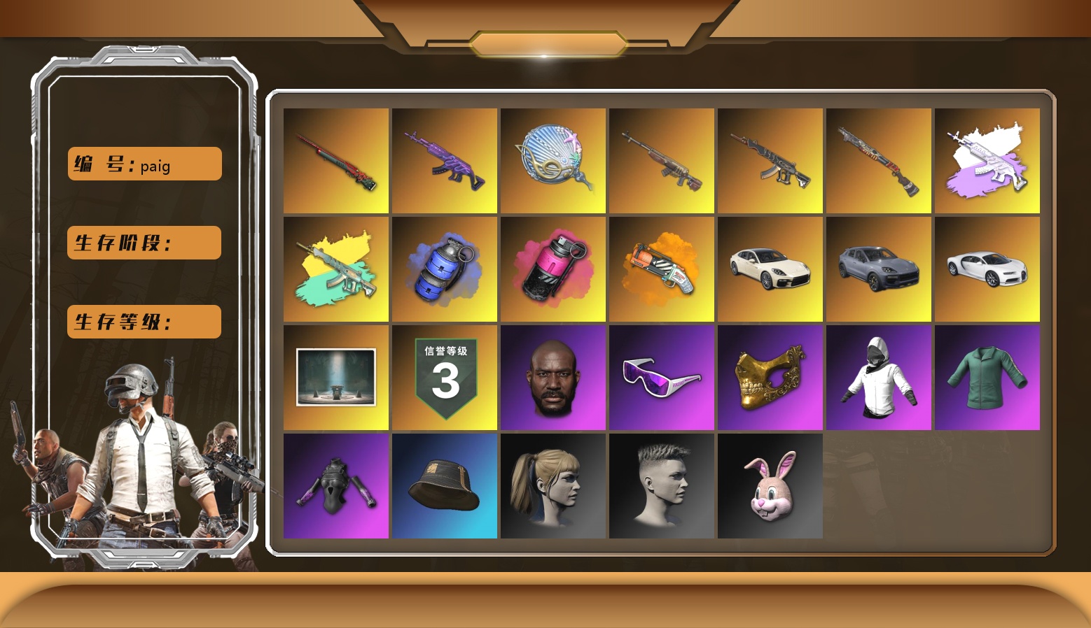 10级火麒麟 8级南瓜M4 1级刻耳柏洛斯M249 珊瑚色烟雾弹 柏林鞋 小丑女 保时捷911 兰博基尼SUV 冬季藏匿处 交易所接待室 1张图纸 4320聚合物 滑雪镜 金面 橙色发带 红面巾 黑大衣 活动绿东 发光手臂 白熊鞋 小叮当 滑雪帽 阿狸 尼尔 拉风龙 小马尾 丸子头 西游记 小兔学院 悲喜 绷带AK