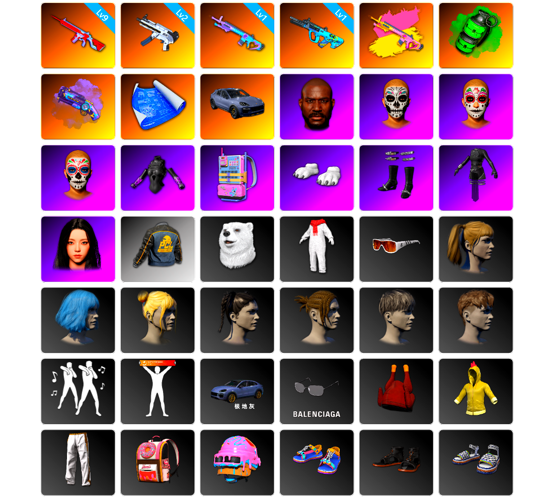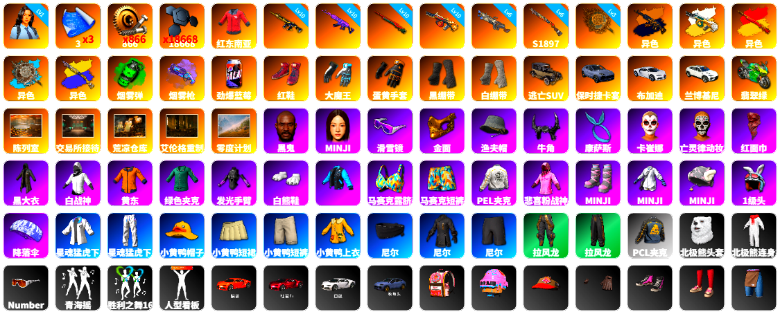 10级美杜莎762 8级德拉贡 1级猛虎98k 1级恶魔ACE 1级无信号M4 1级魔咒之力Mk12 保时捷911 交易所接待室 2张图纸 黑鬼 红面巾 黑大衣 阿狸 小马尾 丸子头 胜利之舞39