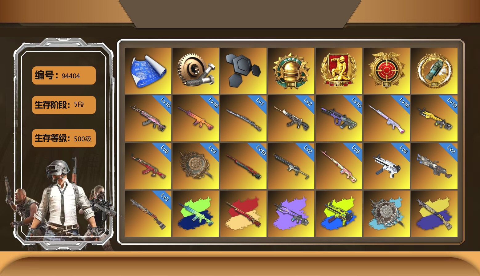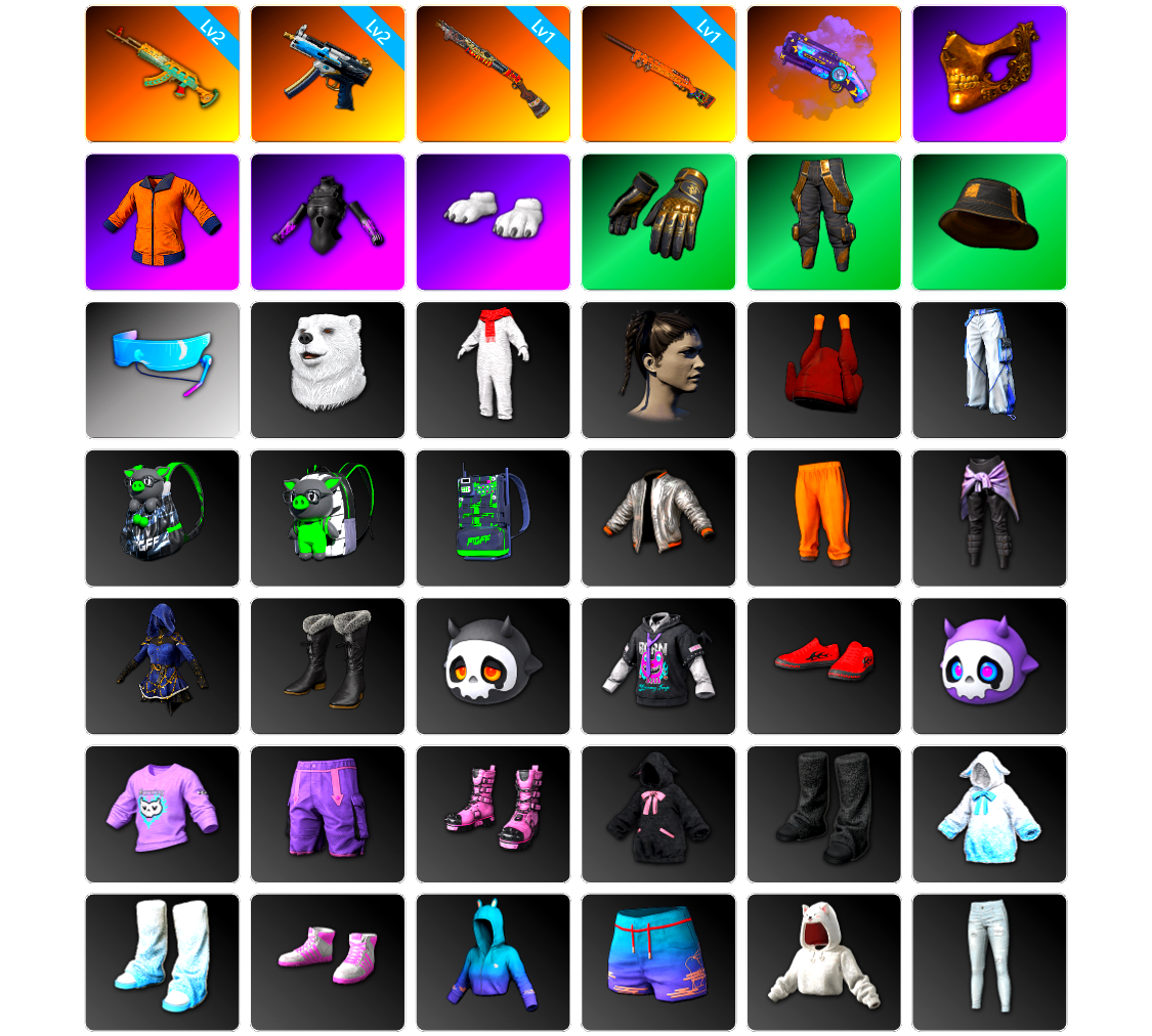 小黑盒 10级火麒麟 10级南瓜M4 10级霓虹AUG 10级小兔MK12 10级玩偶炮 10级孙悟空M24 6级圣诞AK 6级无重力MP5K 5级德拉贡 3级烈日灼烧-S1897 3级唐三藏平底锅 2级恶魔ACE 2级沙悟净MINI 2级刻耳柏洛斯M249 1级猛虎98k 南瓜M4(异色) 小兔MK12(异色) 孙悟空M24(异色) 无重力MP5K(异色) S1897(异色) 唐三藏(异色) 珊瑚色烟雾弹 橙色狂怒之雾-M79 8张图纸 9384聚合物 蜗牛币 柏林鞋 黑绷带 小丑女 小丑男 保时捷911 兰博基尼奢华版 迈凯伦硅质白版 马丁SUV 胜利密室 交易所接待室 黑鬼 滑雪镜 金面 牛角 丑男妆容 马东锡 橙色发带 红面巾 黑大衣 白战神 小战神 活动绿东 发光手臂 萨芬裤 白熊鞋 粉战神 小黄鸭 拉风龙 车漆 小马尾 丸子头 西游记 脏辫 青海摇 小兔学院 街头霸王 悲喜 绷带AK 滑雪帽 PGC 2021套装 胜利之舞39 嘉米-加农钉 隆-升龙拳 哎呀!抱歉 枪炮洗礼 春丽凤翼扇
