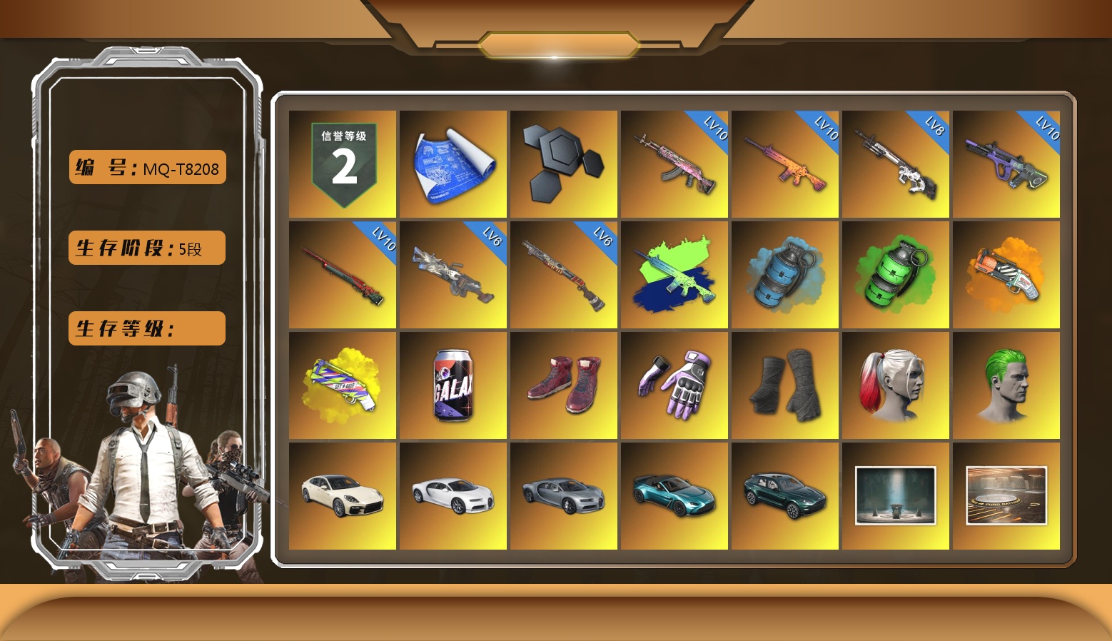 10级火麒麟 10级南瓜M4 10级霓虹AUG 10级孙悟空M24 8级赛博MK12 6级刻耳柏洛斯M249 6级烈日灼烧-S1897 南瓜M4(异色) 天蓝色烟雾弹 翡翠色烟雾弹 橙色狂怒之雾-M79 黄色狂怒之雾-M79 柏林鞋 小黑盒 黑绷带 小丑女 小丑男 帕拉梅拉 布加迪跑车 布加迪奢华版跑车 马丁敞篷跑车 马丁SUV 胜利密室 陈列室 交易所接待室 武器神龛 16张图纸 3450聚合物 黑鬼 9s发型 滑雪镜 金面 牛角 丑男妆容 红面巾 黑大衣 白战神 小战神 黄东 活动绿东 发光手臂 电磁背包 萨芬裤 白熊鞋 小叮当 粉战神 阿狸 小黄鸭 尼尔 拉风龙 小马尾 丸子头 西游记 脏辫 爱的主打歌 青海摇 小兔学院 悲喜 枪炮洗礼