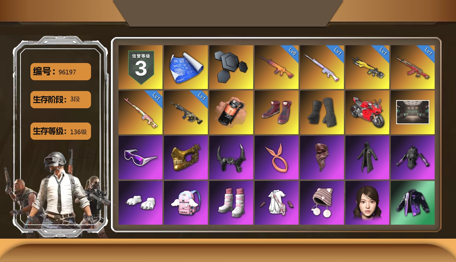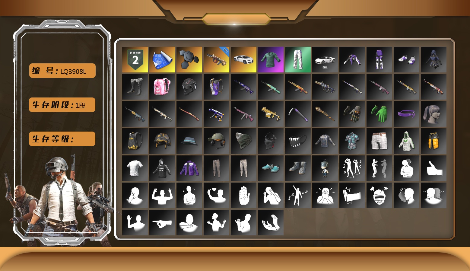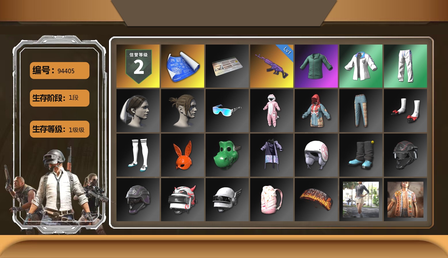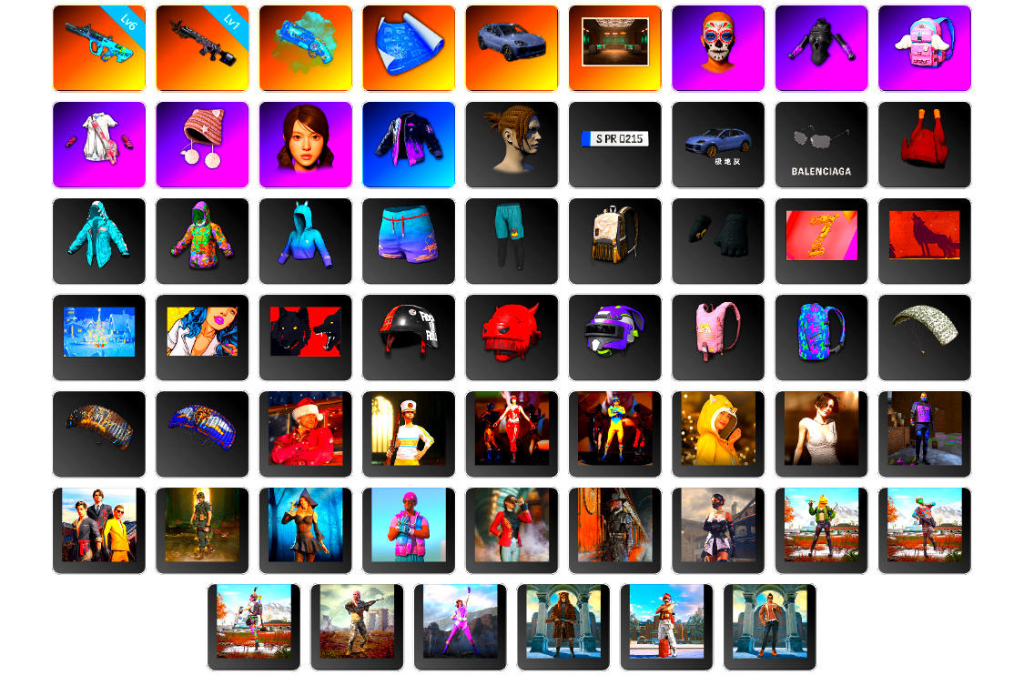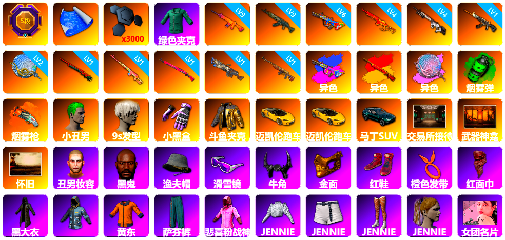 生存5阶段 0张图纸 3000聚合物 9级南瓜M4 9级青龙762 6级爆裂AUG 4级圣诞mini 4级赛博MK12 1级恶魔ACE 2级塞壬平底锅 1级孙悟空M24 1级德拉贡 1级午夜惊魂98k 1级刻耳柏洛斯M249 爆裂AUG(异色) 孙悟空M24(异色) 塞壬 - 平底锅(异色) 翡翠色烟雾弹 橙色狂怒之雾-M79 小丑男 9s发型 小黑盒 斗鱼 跑车 迈凯伦精英版 马丁SUV 交易所接待室 武器神龛 丑男妆容 黑鬼 渔夫帽 滑雪镜 牛角 金面 柏林鞋 橙色发带 红面巾 黑大衣 小战神 黄东 萨芬裤 粉战神 女团