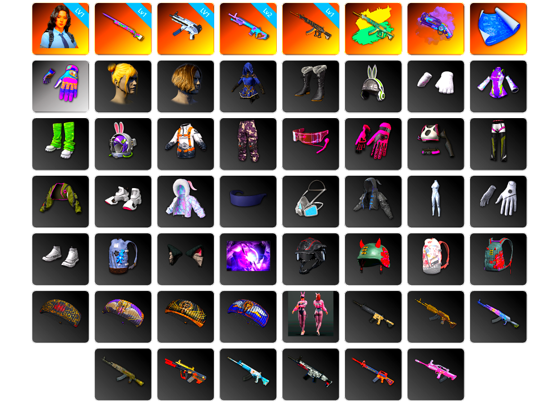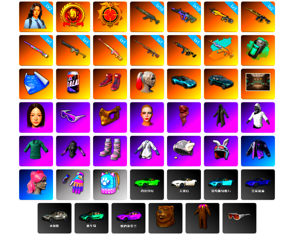 10级南瓜M4 10级青龙762 6级彩虹M24 5级霓虹AUG 2级白虎锅 1级猛虎98k 1级玩偶炮 1级无重力MP5K 1级魔咒之力Mk12 1级妖魔之触ACE 紫色烟雾弹 紫色魔法迷雾-M79 黑绷带 迈凯伦硅质白版 1张图纸 2368聚合物 黑鬼 滑雪镜 金面 橙色发带 发光手臂 白熊鞋 女团 小黄鸭 拉风龙 车漆 小马尾 小绿头 丸子头 脏辫 小兔学院 悲喜 绷带AK PGC 2021套装 胜利之舞39