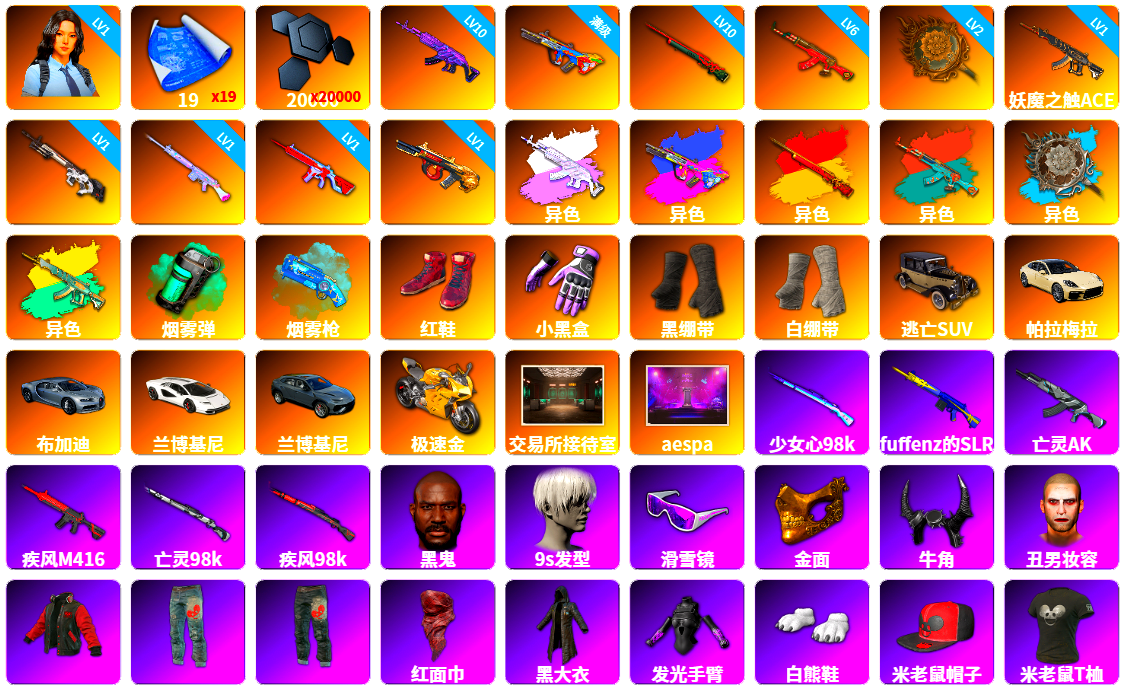 1级瀚娜 19张图纸 20000聚合物 10级美杜莎762 满级级爆裂AUG 10级孙悟空M24 6级圣诞AK 2级唐三藏平底锅 1级妖魔之触ACE 1级赛博MK12 1级玩偶炮 1级无信号M4 1级弥诺陶洛斯AUG 美杜莎(异色) 爆裂AUG(异色) 孙悟空M24(异色) 圣诞AK(异色) 唐三藏(异色) 妖魔之触(异色) 青色烟雾弹 蓝色魔法迷雾-M79 柏林鞋 小黑盒 黑绷带 白绷带 帕拉梅拉 布加迪奢华版跑车 兰博基尼跑车 兰博基尼奢华版 杜卡迪极速金 交易所接待室 aespa 少女98k 黑鬼 9s发型 滑雪镜 金面 牛角 丑男妆容 红面巾 黑大衣 发光手臂 白熊鞋 橙运动 监狱服 渐变装 粉战神 aespa女团 阿狸 尼尔 拉风龙 鸡斯卡夹克 车漆 小马尾 丸子头 西游记 脏辫 爱的主打歌 青海摇 小兔学院 悲喜 绷带AK