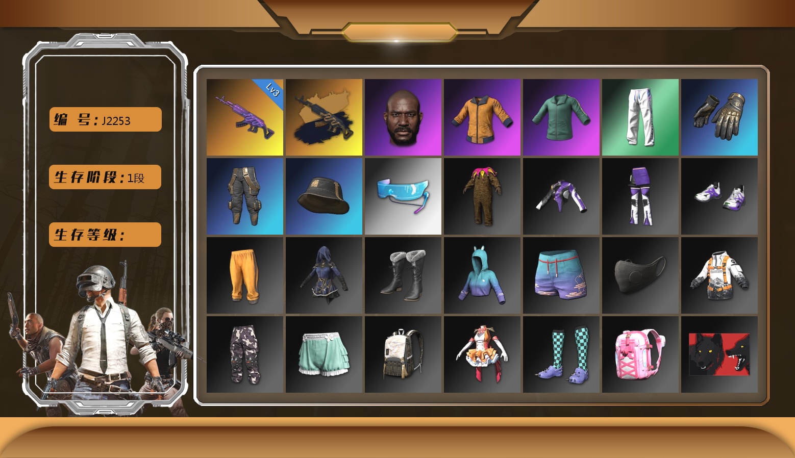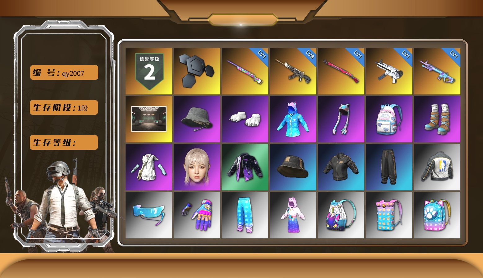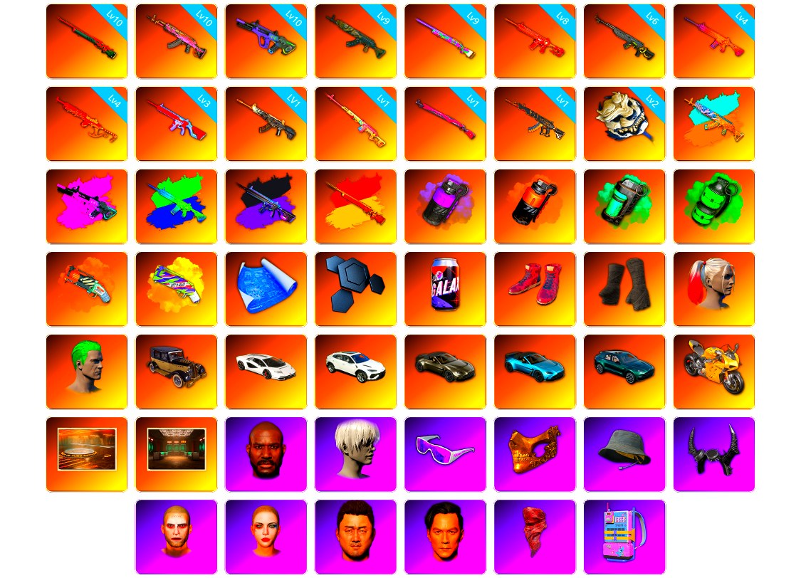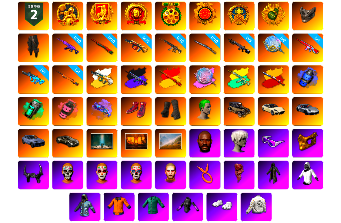 柏林面具 柏林裤 10级美杜莎762 10级孙悟空M24 10级弥诺陶洛斯AUG 10级妖魔之触ACE 10级猛虎98k 5级暗影之主Mk12 2级塞壬平底锅 1级无信号M4 1级GD-AUG 1级夜曲M24 弥诺陶洛斯AUG(异色) 无信号M4(异色) 孙悟空M24(异色) 塞壬 - 平底锅(异色) 妖魔之触(异色) 猛虎98K(异色) 蓝色烟雾弹 青色烟雾弹 粉色烟雾弹 紫色魔法迷雾-M79 柏林鞋 黑绷带 小丑男 帕拉梅拉 保时捷911 保时捷卡宴 马丁跑车 胜利密室 武器神龛 黑鬼 9s发型 滑雪镜 金面 牛角 丑男妆容 橙色发带 红面巾 黑大衣 白战神 小战神 黄东 活动绿东 发光手臂 白熊鞋 粉战神 阿狸 小黄鸭 尼尔 拉风龙 后街车库 车漆 小马尾 丸子头 青海摇 小兔学院 悲喜 西游记 胜利之舞39 枪炮洗礼