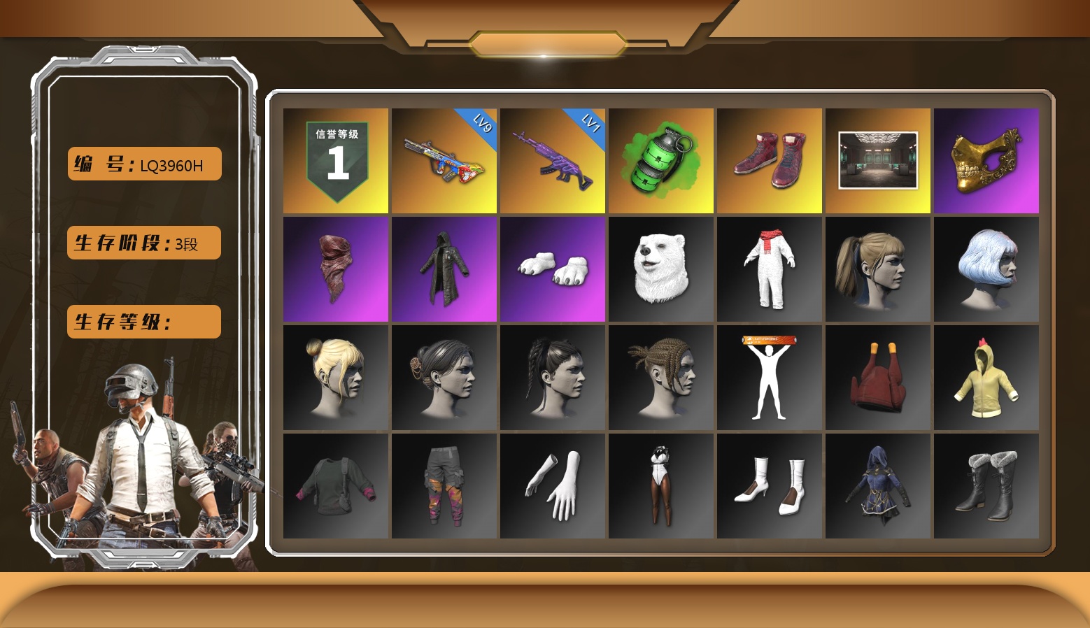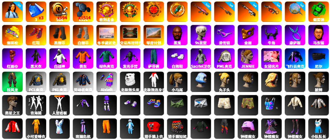 1级瀚娜 3张图纸 蜗牛币 1514聚合物 收割者金标 10级火麒麟 9级齿轮炮 4级赛博MK12 9级弥诺陶洛斯AUG 3级塞壬平底锅 翡翠色烟雾弹 黄色狂怒之雾-M79 柏林鞋 黑绷带 白绷带 冬季藏匿处 交易所接待室 黑鬼 9s发型 滑雪镜 金面 牛角 康萨斯 马东锡 红面巾 黑大衣 白战神 黄东 活动绿东 发光手臂 萨芬裤 白熊鞋 女团 尼尔 拉风龙 小马尾 丸子头 脏辫 青海摇 小兔学院 悲喜 西游记 滑雪帽