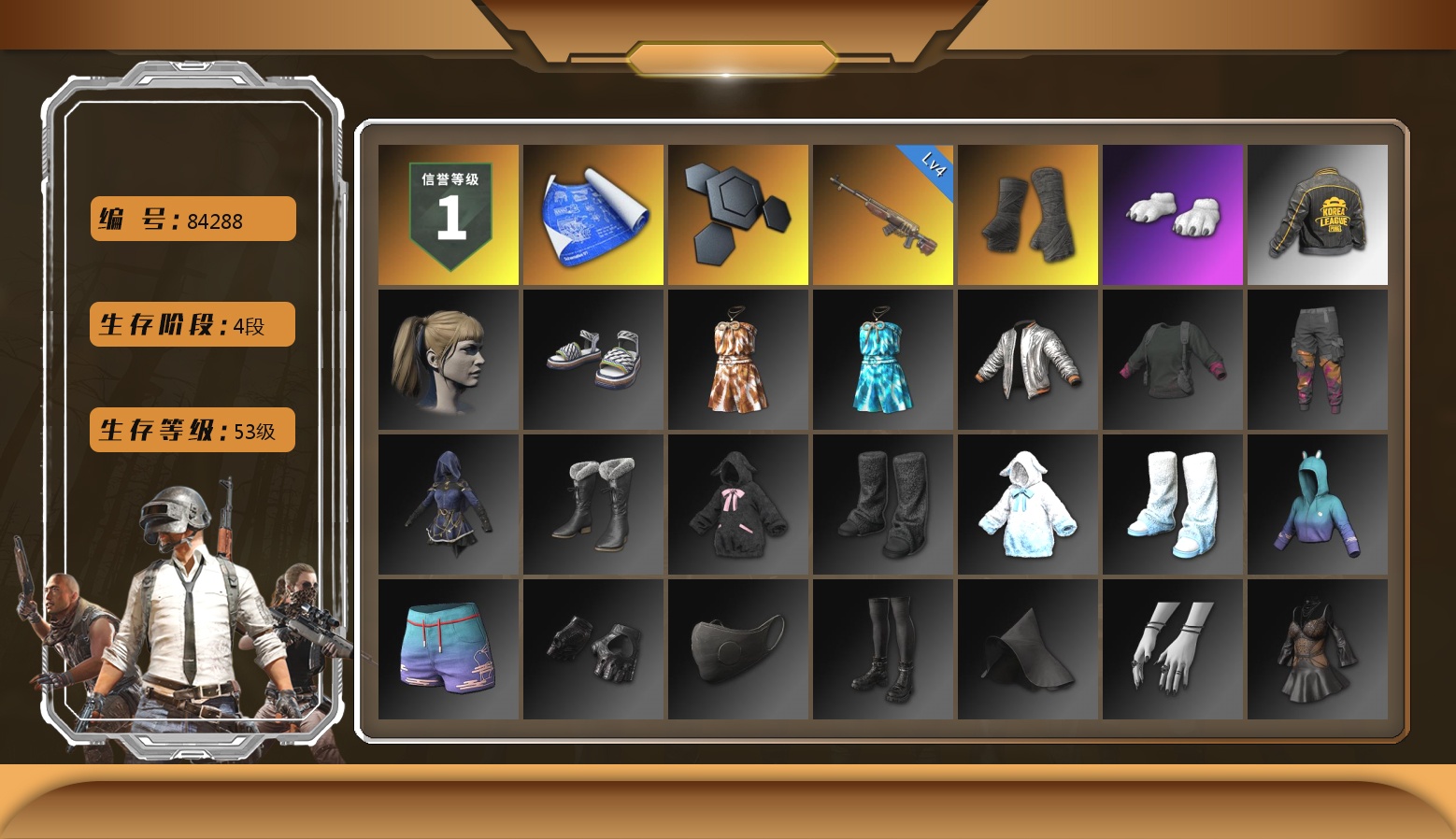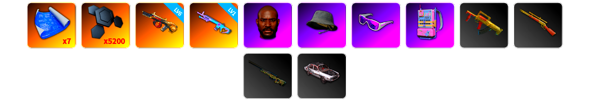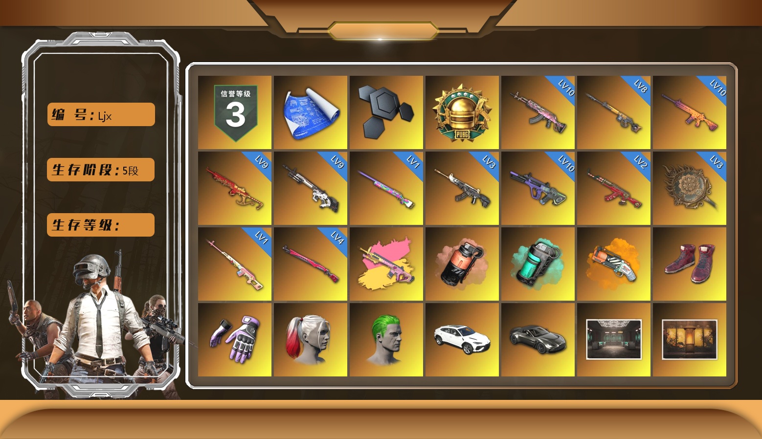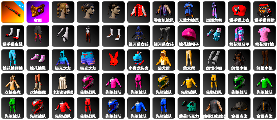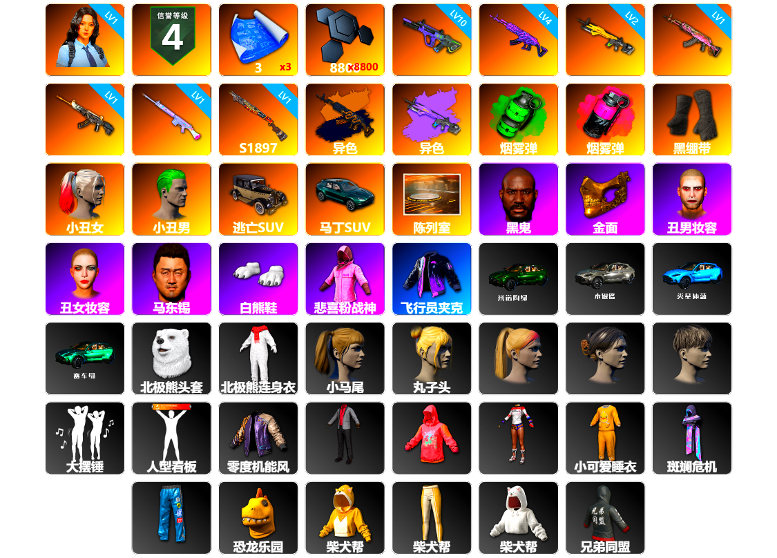 双头尼尔10级火麒麟 10级南瓜M4 10级霓虹AUG 9级圣诞mini 9级赛博MK12 8级齿轮炮 4级午夜惊魂98K 3级恶魔ACE 3级唐三藏平底锅 2级圣诞AK 1级彩虹M24 1级德拉贡 魔咒Mk12(异色)