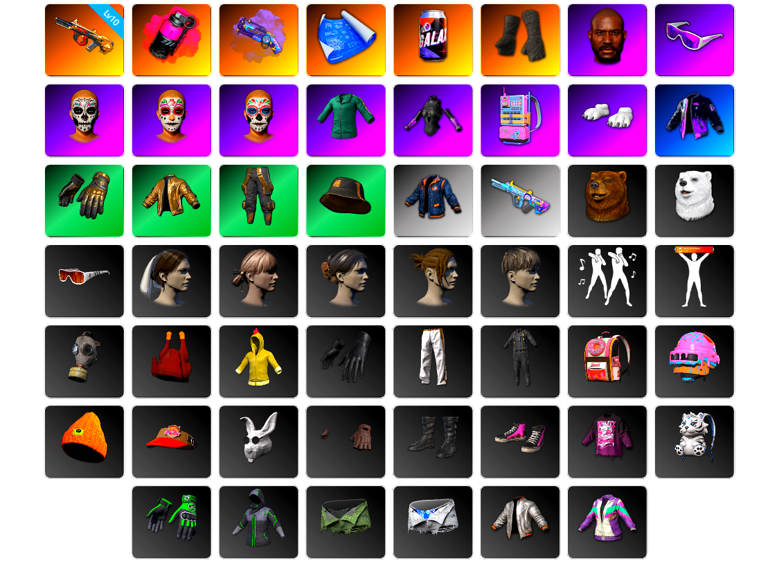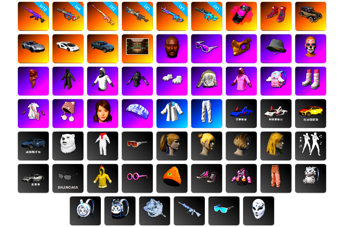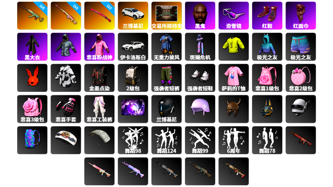 5级水麒麟 3级德拉贡 2级午夜惊魂98k 兰博基尼SUV 交易所接待室 黑鬼 滑雪镜 柏林鞋 红面巾 黑大衣 小战神 粉战神 车漆 悲喜