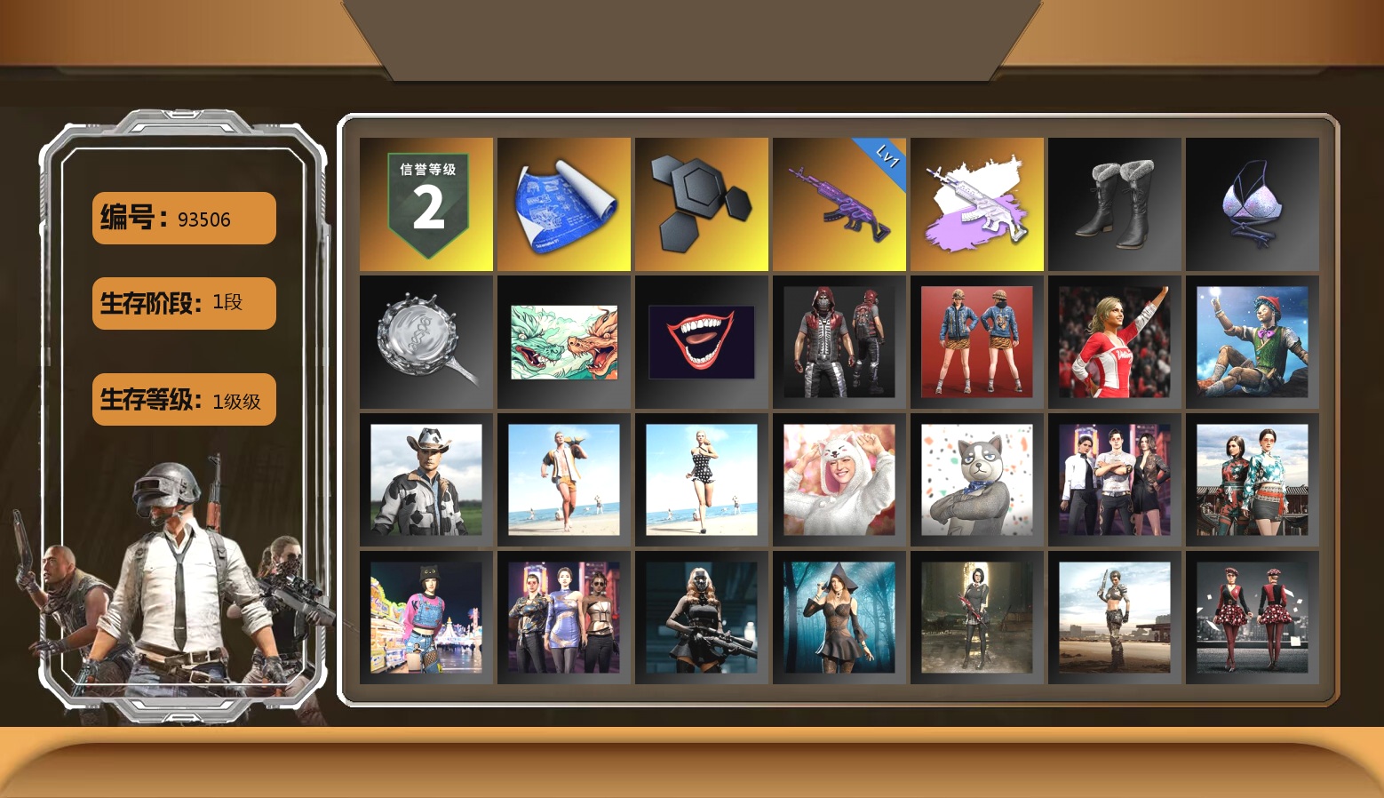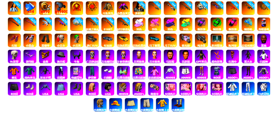 1级瀚娜 14张图纸 蜗牛币 11600聚合物 斗鱼 小黑盒夹克 5级多利安 6级齿轮炮 4级赛博MK12 6级玄武SKS 3级白虎锅 10级霓虹AUG 6级圣诞AK 10级猪八戒M4 2级唐三藏平底锅 10级孙悟空M24 10级午夜惊魂98K 5级无重力MP5K 10级美杜莎762 2级塞壬平底锅 7级妖魔之触ACE 6级烈日灼烧-S1897 1级时空使者M4 美杜莎(异色) 猪八戒M4(异色) 午夜惊魂98K(异色) 妖魔之触(异色) 紫色烟雾弹 翡翠色烟雾弹 品红色烟雾弹 蓝色魔法迷雾-M79 柏林鞋 黑绷带 小丑女 小丑男 布加迪奢华版跑车 迈凯伦玛瑙黑版 马丁敞篷跑车 马丁SUV 杜卡迪暮光粉 杜卡迪纯净黑 胜利密室 陈列室 交易所接待室 黑鬼 9s发型 滑雪镜 金面 渔夫帽 牛角 丑男妆容 马东锡 橙色发带 红面巾 黑大衣 白战神 黄东 活动绿东 发光手臂 竞猜裤 电磁背包 萨芬裤 白熊鞋 粉战神 女团 小黄鸭 可可 尼尔 拉风龙 车漆 小马尾 粉头 丸子头 西游记 脏辫 爱的主打歌 小兔学院 悲喜 绷带AK 滑雪帽 PGC 2021套装 胜利之舞39 枪炮洗礼