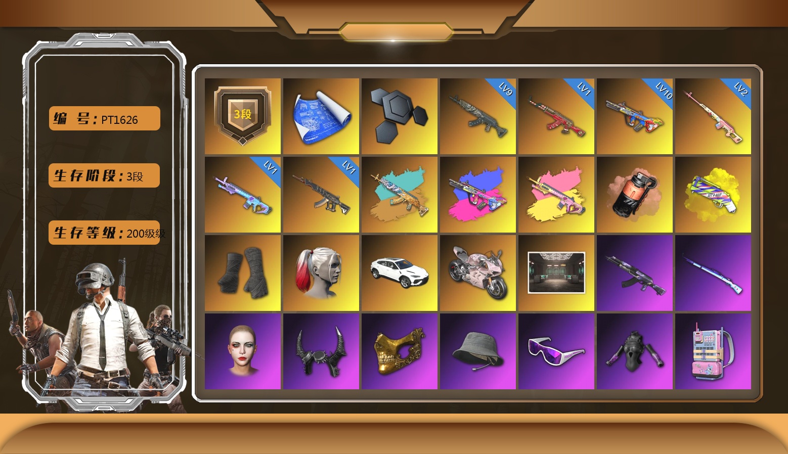 ID[261447][PZ3332]8级孙悟空M24 3级水麒麟 2级赛博MK12 张图纸 柏林鞋 兰博基尼SUV 马丁跑车 交易所接待室 红面巾 黑大衣 发光手臂 拉风龙 小马尾 丸子头 青海摇 小兔学院 悲喜 西游记 绷带AK 枪炮洗礼