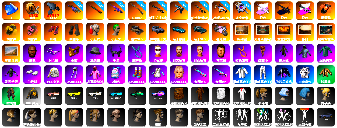 10级爆裂AUG 8级妖魔之触ACE 珊瑚色烟雾弹 翡翠色烟雾弹 黄色狂怒之雾-M79 兰博基尼SUV 迈凯伦硅质白版 6132聚合物 黑鬼 滑雪镜 金面 橙色发带 发光手臂 白熊鞋 拉风龙 小马尾 丸子头 脏辫 青海摇 小兔学院 绷带AK