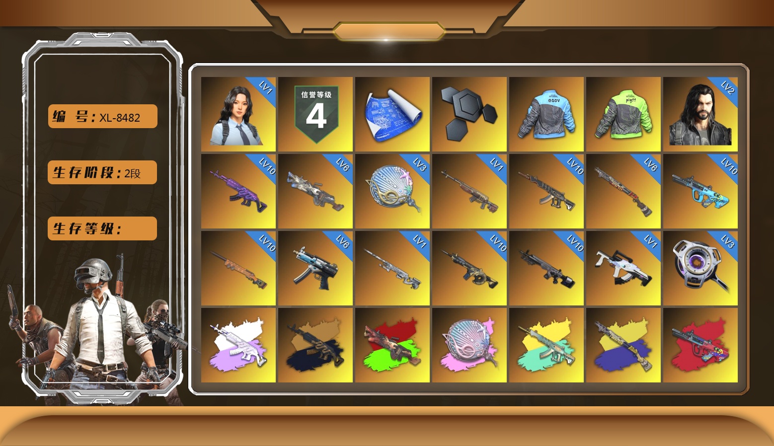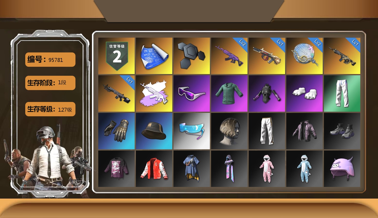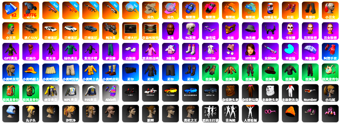 8级赛博MK12 8级朱雀M4 1级青龙762 1级白虎锅 1级无信号M4 柏林鞋 小丑女 交易所接待室 4张图纸 3440聚合物 滑雪镜 金面 橙色发带 红面巾 黑大衣 橙运动 监狱服 渐变装 滑雪帽 布朗熊 绷带AK 西游记