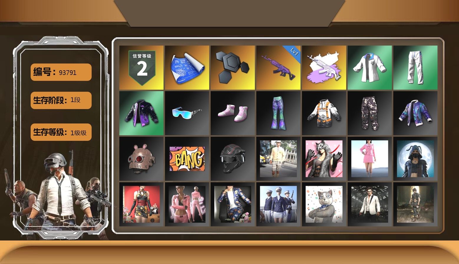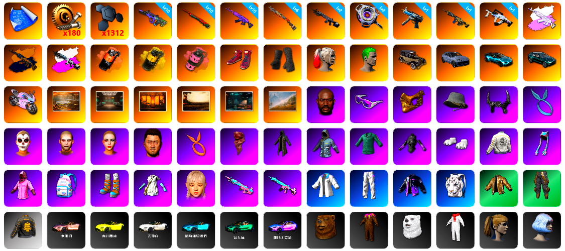 1张图纸 蜗牛币 1312聚合物 10级霓虹AUG 10级孙悟空M24 10级美杜莎762 6级烈日灼烧-S1897 2级暗影之主Mk12 2级虚空使者 1级寒蚀MP5K 1级时空使者M4 1级冰域Groza 美杜莎(异色) 暗影之主Mk12(异色) 珊瑚色烟雾弹 黄色烟雾弹 粉色烟雾弹 柏林鞋 黑绷带 小丑女 小丑男 保时捷卡宴 马丁敞篷跑车 马丁SUV 杜卡迪暮光粉 陈列室 交易所接待室 武器神龛 黑鬼 滑雪镜 金面 渔夫帽 牛角 康萨斯 卡崔娜 丑男妆容 马东锡 橙色发带 红面巾 黑大衣 小战神 活动绿东 发光手臂 白熊鞋 粉战神 拉风龙 车漆 小马尾 丸子头 西游记 脏辫 爱的主打歌 青海摇 小兔学院 悲喜 绷带AK 滑雪帽