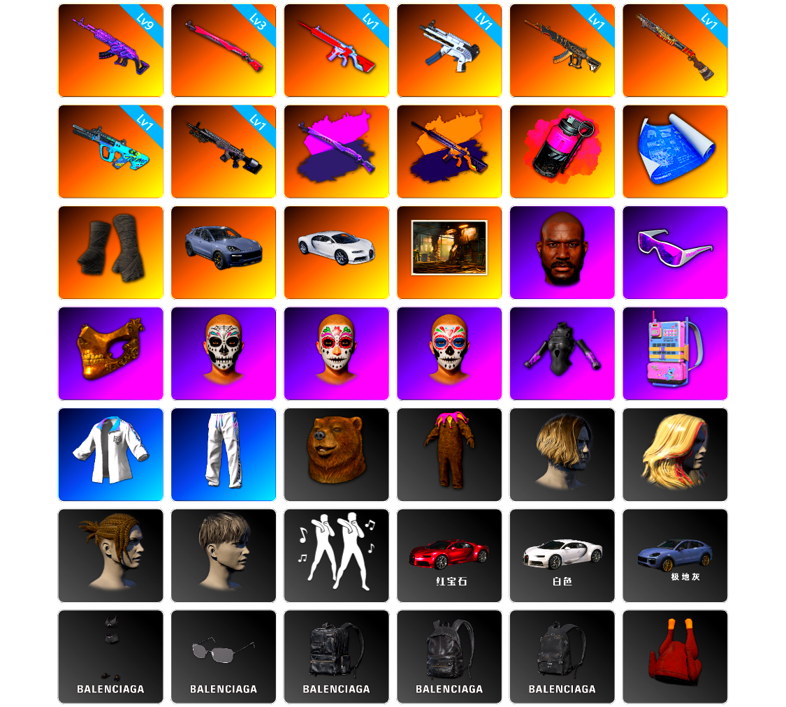 ID[265548][PZ3506]9级美杜莎762 3级午夜惊魂98K 1级无信号M4 1级无重力MP5K 1级妖魔之触ACE 1级烈日灼烧-S1897 1级GD-AUG 1级暗影之主Mk12 午夜惊魂98K(异色) 无信号(异色) 品红色烟雾弹 张图纸 黑绷带 保时捷卡宴 布加迪跑车 黑鬼 滑雪镜 金面 发光手臂 电磁背包 脏辫 青海摇 车漆 小兔学院 绷带AK 胜利之舞39