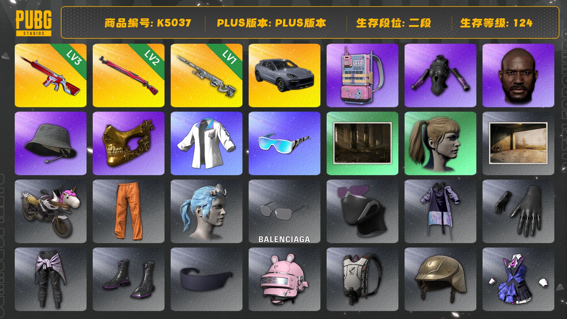 [K5037]2段124级,信誉2,3级无信号M416,2级午夜惊魂98K,1级幽影残魂AWM,保时捷卡宴,保时捷,发光手臂,黑鬼,金面,星魂虎虎生威大礼包,电磁包,小马尾