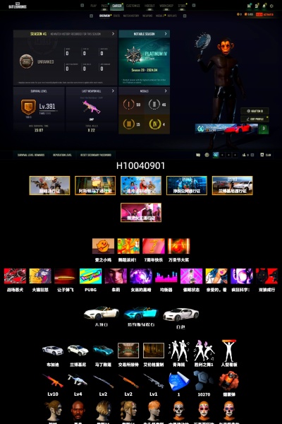 H10040901 10级南瓜M4 2级猛虎98k 2级夜曲M24 1级幽影残魂AWM 4级冰域Groza 珊瑚色烟雾弹 布加迪跑车 兰博基尼SUV 马丁敞篷跑车 交易所接待室 黑鬼 滑雪镜 金面 发光手臂 白熊鞋 车漆 脏辫 青海摇 小兔学院 绷带AK 滑雪帽 胜利之舞39 3阶段391