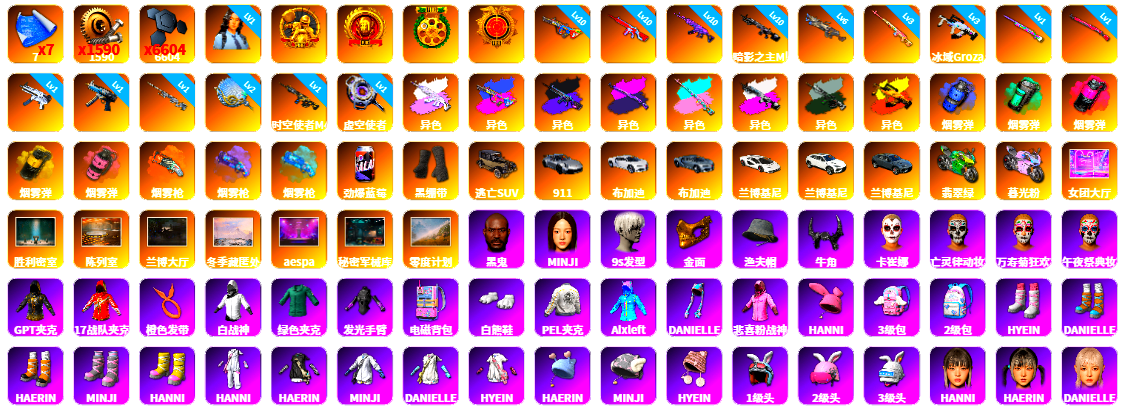 7张图纸 蜗牛币 6604聚合物 1级瀚娜 10级爆裂AUG 10级无信号M4 10级美杜莎762 10级暗影之主Mk12 6级刻耳柏洛斯M249 3级德拉贡 3级冰域Groza 1级彩虹M24 1级午夜惊魂98K 1级无重力MP5K 1级寒蚀MP5K 1级幽影残魂AWM 2级塞壬平底锅 1级时空使者M4 1级虚空使者 美杜莎(异色) 爆裂AUG(异色) 无信号M4(异色) 午夜惊魂98K(异色) 德拉贡(异色) 暗影之主Mk12(异色) 时空使者M4(异色) 冰域Groza(异色) 蓝色烟雾弹 青色烟雾弹 品红色烟雾弹 黄色烟雾弹 粉色烟雾弹 橙色狂怒之雾-M79 紫色魔法迷雾-M79 蓝色魔法迷雾-M79 黑绷带 保时捷911 布加迪跑车 布加迪奢华版跑车 兰博基尼跑车 兰博基尼SUV 兰博基尼奢华版 杜卡迪翡翠绿 杜卡迪暮光粉 女团大厅 胜利密室 陈列室 兰博大厅 冬季藏匿处 aespa 黑鬼 MINJI 9s发型 金面 渔夫帽 牛角 卡崔娜 橙色发带 白战神 活动绿东 发光手臂 电磁背包 白熊鞋 小叮当 粉战神 2024女团 aespa女团 阿狸 小黄鸭 尼尔 拉风龙 车漆 小马尾 丸子头 脏辫 爱的主打歌 青海摇 小兔学院 悲喜 绷带AK 滑雪帽 胜利之舞39
