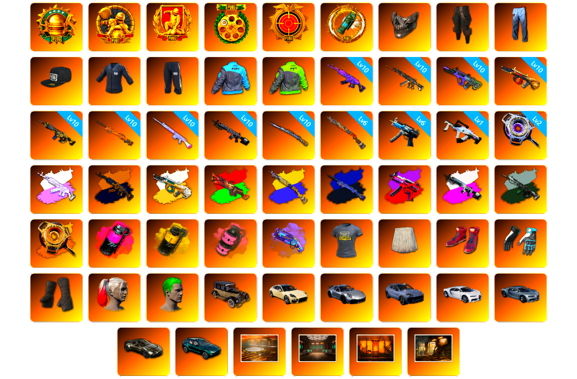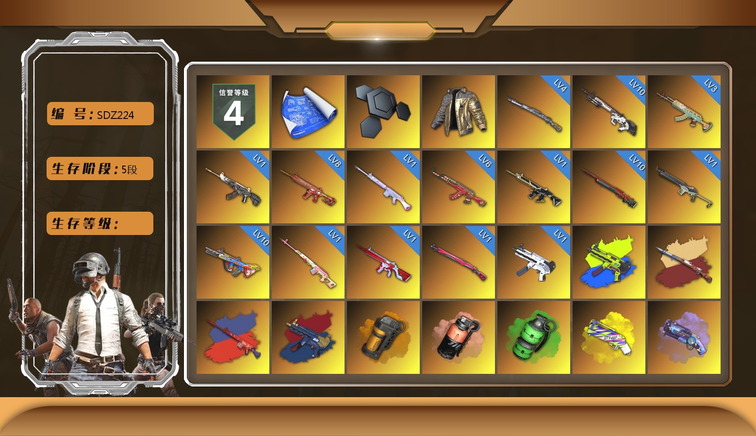 斗鱼 10级赛博MK12 10级孙悟空M24 10级爆裂AUG 8级朱雀M4 6级圣诞AK 4级猛虎98k 3级水麒麟 1级恶魔ACE 1级玩偶炮 1级猪八戒M4 1级沙悟净MINI 1级德拉贡 1级无信号M4 1级午夜惊魂98K 1级无重力MP5K 无重力MP5K(异色) 猛虎98K(异色) 玩偶炮(异色) 橘色烟雾弹 珊瑚色烟雾弹 翡翠色烟雾弹 黄色狂怒之雾-M79 紫色魔法迷雾-M79 柏林鞋 黑绷带 小丑男 布加迪跑车 布加迪奢华版跑车 兰博基尼跑车 兰博基尼SUV 兰博基尼奢华版 迈凯伦硅质白版 马丁跑车 杜卡迪纯净黑 陈列室 兰博大厅 冬季藏匿处 2张图纸 9620聚合物 滑雪镜 金面 渔夫帽 丑男妆容 橙色发带 红面巾 黑大衣 白战神 小战神 黄东 活动绿东 发光手臂 电磁背包 白熊鞋 小叮当 aespa女团 滑雪帽 拉风龙 小马尾 小绿头 丸子头 西游记 小兔学院 绷带AK 胜利之舞39
