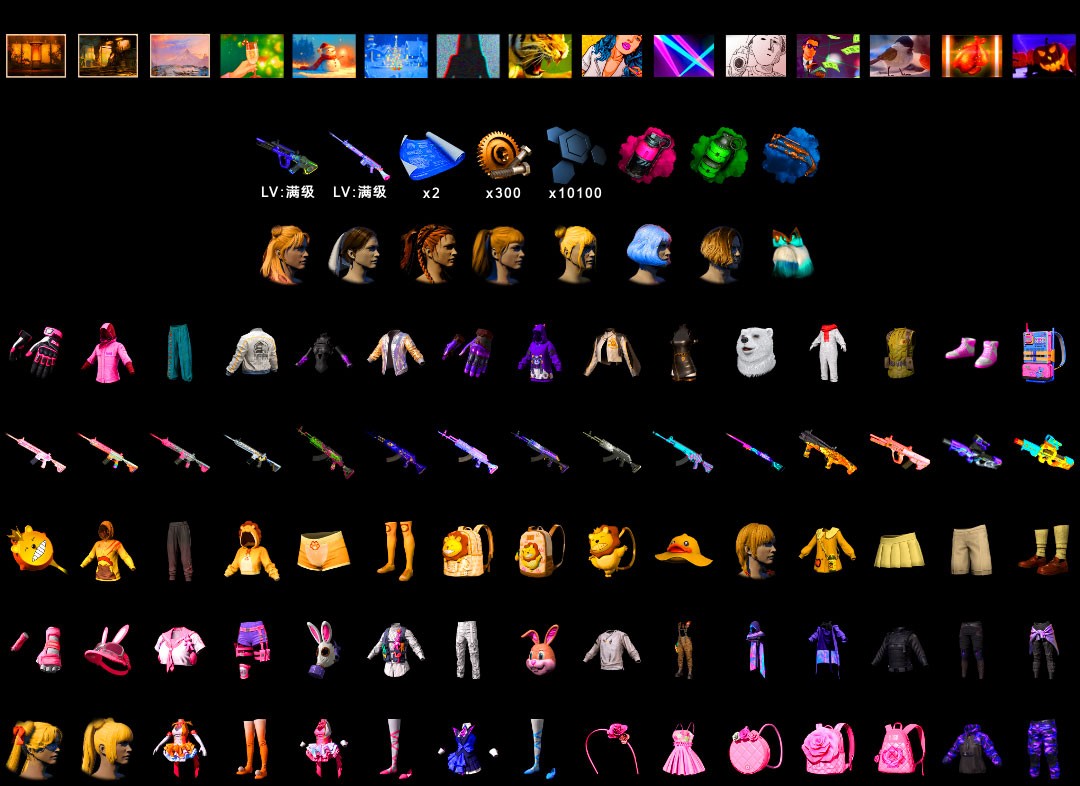 10级玩偶炮 柏林鞋 交易所接待室 2张图纸 滑雪镜 红面巾 黑大衣 发光手臂 竞猜裤 白熊鞋 橙运动 监狱服 渐变装 粉战神 滑雪帽 粉头 脏辫 悲喜 绷带AK