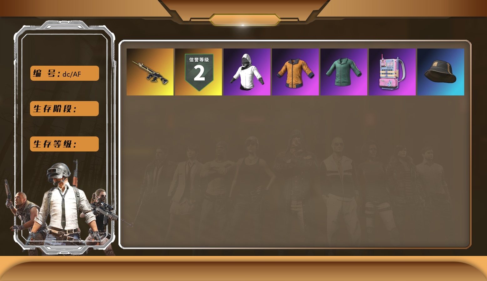 信誉等级三 10级彩虹M24 10级朱雀M4 10级青龙762 3级白虎锅 1级恶魔ACE 1级玄武SKS 1级玩偶炮 1级猪八戒M4 1级无重力MP5K 青龙762(异色) 无重力MP5K(异色) 紫色烟雾弹 天蓝色烟雾弹 橘色烟雾弹 翡翠色烟雾弹 黄色狂怒之雾-M79 小丑女 小丑男 小黑盒 迈凯伦玛瑙黑版 交易所接待室 9张图纸 7192聚合物 丑男妆容 内马尔 渔夫帽 滑雪镜 康萨斯 牛角 金面 黑绷带 柏林鞋 橙色发带 红面巾 黑大衣 活动绿东 发光手臂 电磁背包 白熊鞋 小叮当 小黄鸭 布朗熊 车漆 小马尾 小绿头 丸子头 脏辫 小兔学院 悲喜 绷带AK