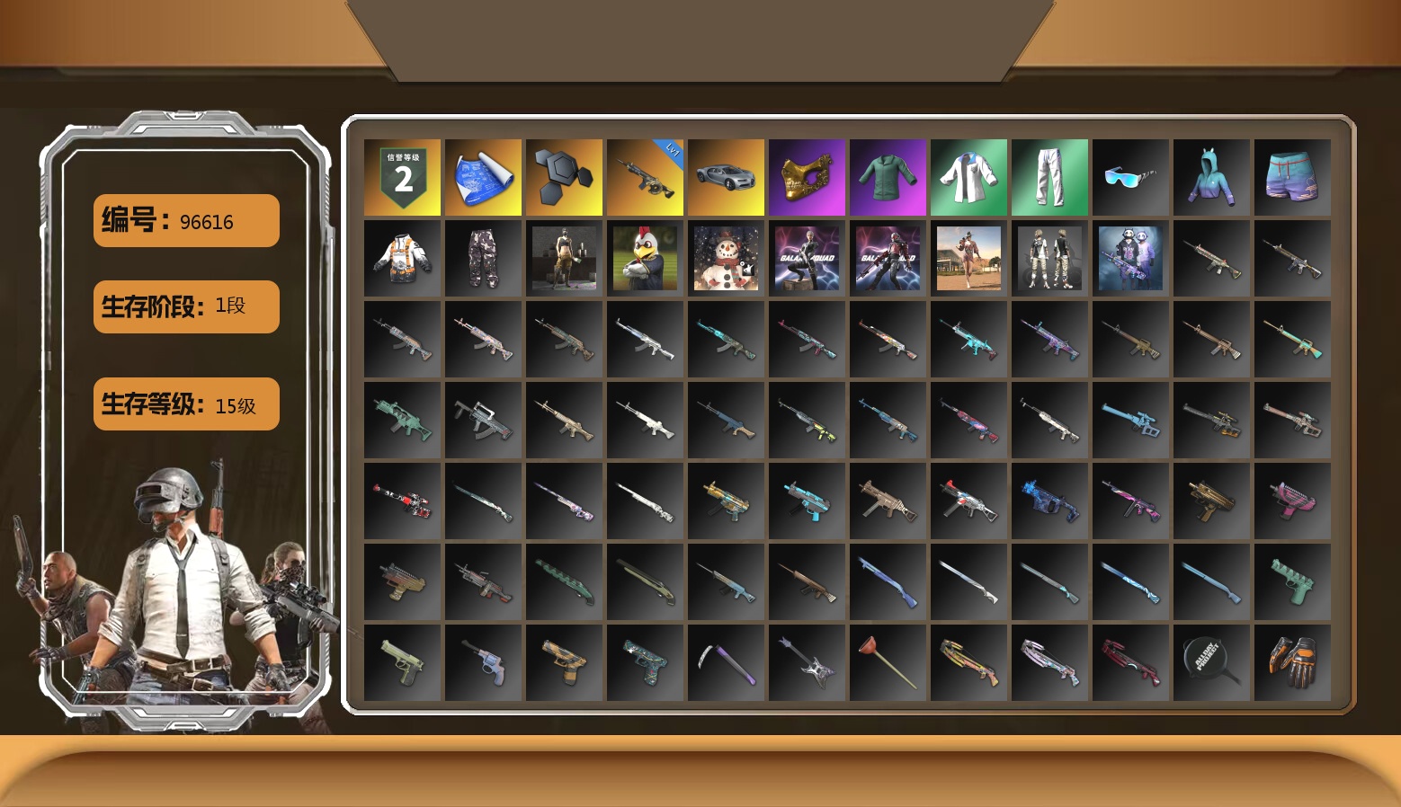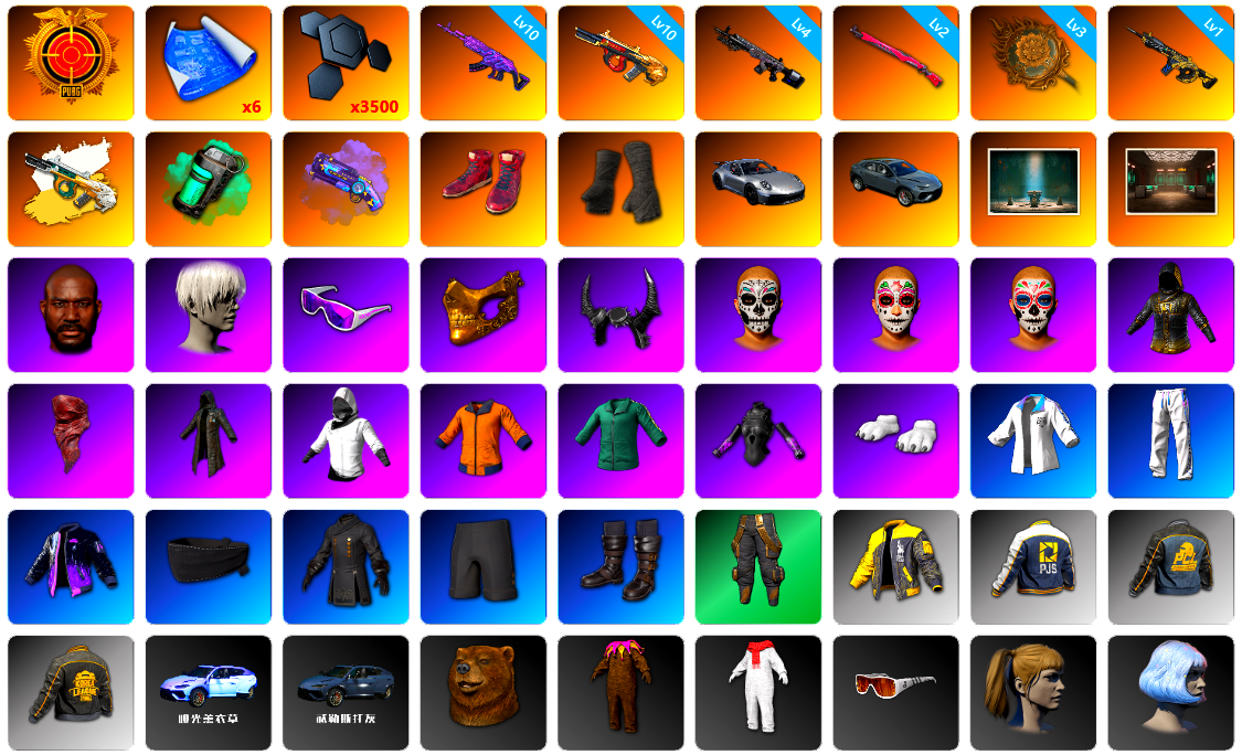 10级齿轮炮 10级南瓜M4 10级猛虎98k 10级孙悟空M24 10级美杜莎762 10级妖魔之触ACE 10级GD-AUG 7级暗影之主Mk12 6级无重力MP5K 6级幽影残魂AWM 3级白虎锅 1级瀚娜 1级冰域Groza 美杜莎(异色) 妖魔之触(异色) 猛虎98K(异色) MP5K(异色) GD-AUG(异色) 暗影之主Mk12(异色) 蓝色烟雾弹 珊瑚色烟雾弹 青色烟雾弹 橙色狂怒之雾-M79 蓝色魔法迷雾-M79 黑绷带 帕拉梅拉 保时捷911 布加迪跑车 布加迪奢华版跑车 兰博基尼SUV 马丁跑车 马丁敞篷跑车 马丁SUV 杜卡迪翡翠绿 陈列室 冬季藏匿处 武器神龛 6张图纸 7798聚合物 黑鬼 金面 渔夫帽 马东锡 发光手臂 萨芬裤 白熊鞋 aespa女团 小马尾 丸子头 西游记 脏辫 小兔学院 悲喜 PGC 2021套装