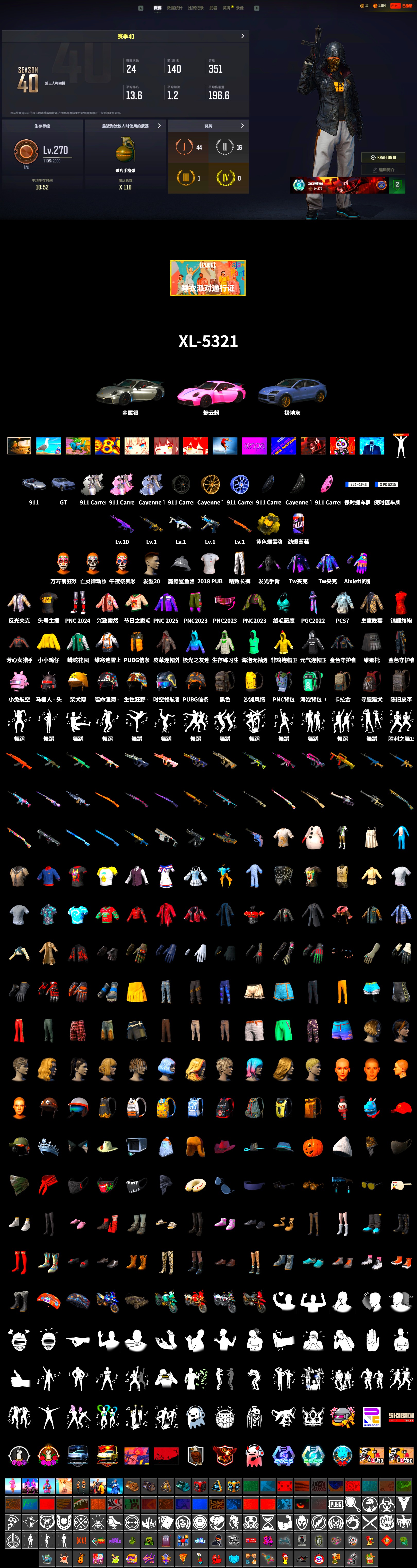 ❤找回包赔❤皮肤:10级美杜莎762 1级夜曲M24 1级寒蚀MP5K 1级时空使者M4 1级冰域Groza 劲爆蓝莓 保时捷911 保时捷卡宴 信誉等级二 亡灵律动妆容 万寿菊狂欢妆容 午夜祭典妆容 发光手臂 皮革连帽外套 (黑) 飞行员夹克 Aixleft 发型43 发型21 发型56 发型51 人型看板 非鸡连帽卫衣 精致长裤 斑斓危机 银河系女孩 棉花糖鞋 极光之友 极光之友 小青龙头套 小青龙玩偶服 维娜托手套 维娜托口罩 维娜托水手 维娜托短裙 维娜托短靴 维寒迪雪上运动夹克 维寒迪长裤 老奶奶睡裙 老奶奶睡裤 沉睡女王 头号主播 Twitch Rivals 复古飞行员夹克 开拓者墨镜 开拓者夹克 强袭者短裤 小兔航天局 绒毛小恶魔上衣 曼蒂的手套 曼蒂的发箍 曼蒂的上衣 曼蒂的短裤 曼蒂的短靴 彩糖蛋糕 - M416 灵魂枷锁 - AKM 金色落叶 - AKM 粗糙 (橙色) - AKM 西游记 彩糖蛋糕 - AUG 镀银 - AUG PNC 2023 完美角度 - ACE32 鸡斯卡 - SCAR-L 圆点猎手 - M16A4 灵魂枷锁 - Mk47 Mutant 镀金 - Groza 圆点猎手 - K2 夏日冲浪 - Mini14 雪国风光 - Mk14 镀银 - VSS 数码沙漠迷彩 - Win94 粗糙 (橙色) - Kar98k PNC 2023 完美角度 - Kar98k 鲜花之力 - AWM 彩糖蛋糕 - 莫辛纳甘步枪 PNC 2023 完美角度 - FAMAS 镀银 - UMP 金色守护者 - P90 圆点猎手 - S12K 抽象派 - S1897 毒性 - S1897 海洋哑光(蓝色) - S686 波涛荡漾 - S686 淡雅之力 - R1895 PUBG信条钢管 朋克战斧 小兔学院水手服手套 队长的迷彩手套 准备就绪手套 维寒迪雪上运动手套 雪片手套 疯狂护士手套 飞行员太阳镜 雪片墨镜 老式太阳镜 男性面容15 发型65 发型47 发型55 发型38 发型26 发型20 发型63 发型64 海泡背包(3级) 黑色铆钉背包(3级) 寻腥猎犬背包(2级) 卡拉金本土背包(2级) 陈旧皮革背包(2级) 青花怒放背包(2级) 勇往直前背包(1级) 游戏日背包(1级) 维寒迪雪上运动背包(1级) PUBG信条 - 头盔(2级) 维寒迪雪上运动 - 头盔(1级) 雪人头套 南瓜头 海湾救生员鸭舌帽 夏日渔夫帽(蓝绿色) 队长的迷彩鸭舌帽 春之步伐领巾 露鳍鲨鱼渔夫帽 恶魔的微笑口罩 准备就绪口罩 PCS2 隐形生存者面巾 队长的迷彩面巾 炫酷反光夹克 蟒蛇花园夹克 PCS7 连帽卫衣 雪人玩偶服 锦鲤旗袍 锦鲤唐装 花衬衫(蓝绿色) 雪片夹克 夏日短裤(灰色) 朋克护肩外套(红色) 类星之王的夹克 皇室晚宴服 小小鸡仔外套 2018 PUBG 全明星 T 恤 (韩语) 海泡无袖连帽卫衣 生存练习生连帽卫衣 疾驰杜宾犬T恤 私立学校校服 PUBG信条马甲 兴致索然夹克 节日之家毛衣 船长女儿的水手裙 小小鸡仔T恤 恩度若特技服 T 恤 (白色) T 恤 (灰色) 雪片马甲 金色守护者皮夹克 火力四射夹克 PNC 2025 夹克 水纹长裤(黑色) 肌肉牛仔裤 街头律动长裤 战斗裤 (棕色) 战斗裤 (卡其色) 雪片长裤 海泡短裤 小小鸡仔短裤 拉拉队裙子 Guardian of the Groove Pants 金色守护者战斗长裤 老奶奶的拖鞋 雪片皮鞋 卡拉金拖鞋 沙滩鞋(蓝绿色) 雪人短靴 维寒迪雪上运动短靴 准备就绪运动鞋 高帮运动鞋 船长女儿的凉鞋 寻路者短靴 拉拉队运动鞋 海泡运动鞋 丝袜与校园风鞋子(黑色) 革面悍匪靴 PNC 2024 长靴 孤狼生存者 “双龙会” 摩托车 “加塔尔越野赛”摩托车 “毒蛇猎手” 两栖装甲车 “锈色反叛者” 摩托车 胜利之舞154 aespa - Dark Arts(第2部分) 洒洒水啦 胜利之舞84 胜利之舞86 胜利之舞98 PNC 2023之舞 - 熄灯 Victory Dance - 8th Anniversary 把头摇起来 胜利之舞12 胜利之舞136 胜利之舞35 绝望的祷告 胜利之舞100 特殊快递 胜利之舞7 超级力量 枪炮洗礼 胜利之舞13 特殊问候 胜利之舞26 嫉妒 棒棒哒 挑衅 投降 不耐烦 谢谢 停止! 抖缩 庆祝 哭 踢 笑 愤怒 同意 大厅姿势3 反对 你好 大厅姿势2 大厅姿势1 走吧! 你完蛋了 耸肩 过来 鼓掌 花样滑冰运动员 海鸥的小酌 柴犬帮头盔(2级) 小兔航空航天局 - 头盔(3级) 沙滩风情背包(3级) PNC 2023 背包(3级) 尽染樱色套装 生意兴隆套装 怪盗小兔套装 棉花糖套装 紫喵喵服饰套装 慵懒假日套装 芳心女猎手上衣 被催眠的小浣熊 无重力轻型套装 PNC 2024 胜利之舞142 新年礼物 胜利之舞137 冰雪天使王冠 红色预警 冰雪天使连衣裙 食物中毒 小鸡吐息 四条A 猎手便装丝袜 发型78 冰雪天使长靴 化学战 扎染T恤 史上最佳圣诞毛衣