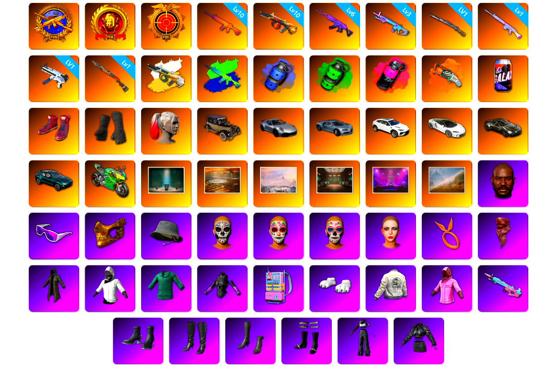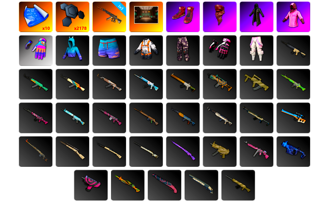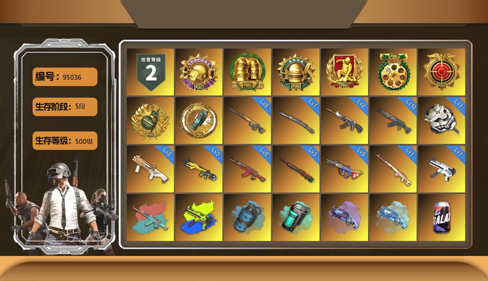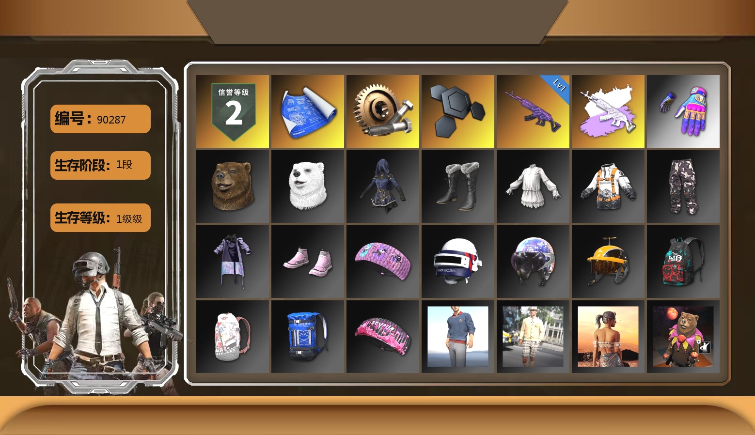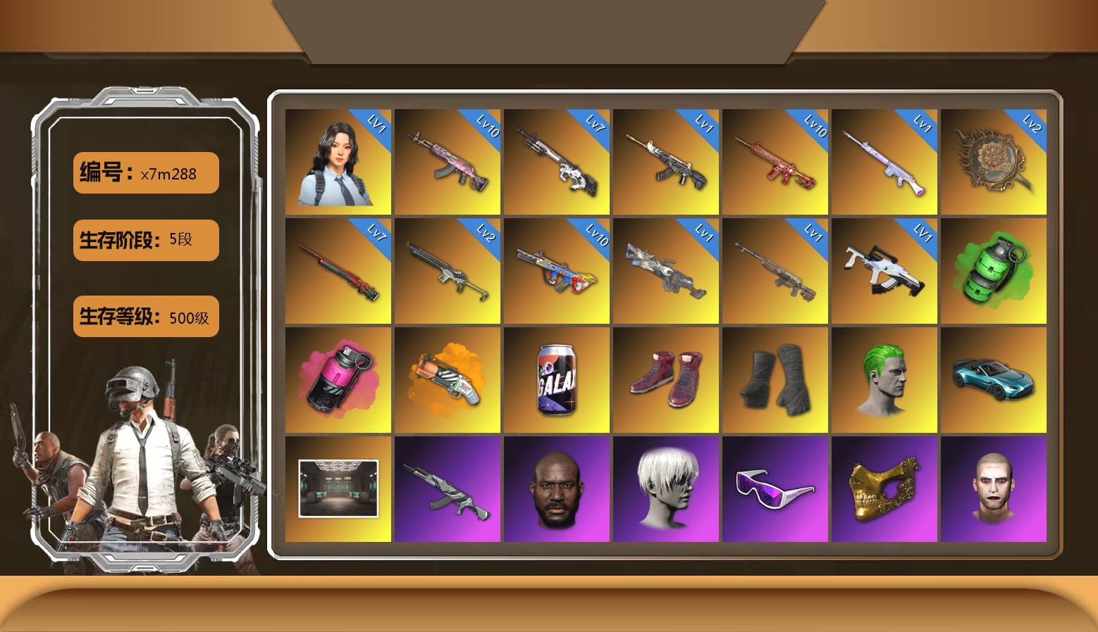 1级瀚娜 收割者金标 10级火麒麟 10级朱雀M4 10级爆裂AUG 7级孙悟空M24 7级赛博MK12 2级沙悟净MINI 2级唐三藏平底锅 1级恶魔ACE 1级玩偶炮 1级刻耳柏洛斯M249 1级时光加农SKS 1级冰域Groza 翡翠色烟雾弹 品红色烟雾弹 橙色狂怒之雾-M79 柏林鞋 黑绷带 小丑男 马丁敞篷跑车 交易所接待室 黑鬼 9s发型 滑雪镜 金面 丑男妆容 橙色发带 红面巾 黑大衣 白战神 小战神 黄东 发光手臂 竞猜裤 萨芬裤 白熊鞋 英特尔夹克 橙运动 监狱服 渐变装 粉战神 阿狸 尼尔 拉风龙 车漆 小马尾 小绿头 粉头 西游记 脏辫 青海摇 小兔学院 悲喜 滑雪帽 胜利之舞39 枪炮洗礼