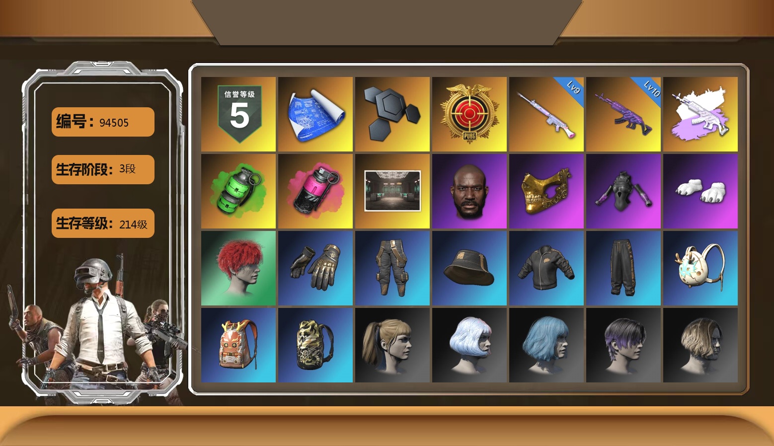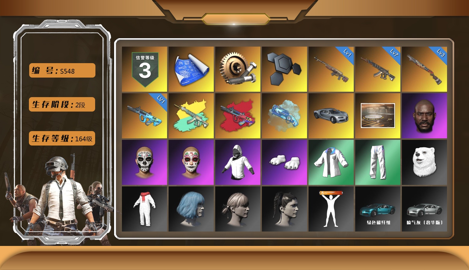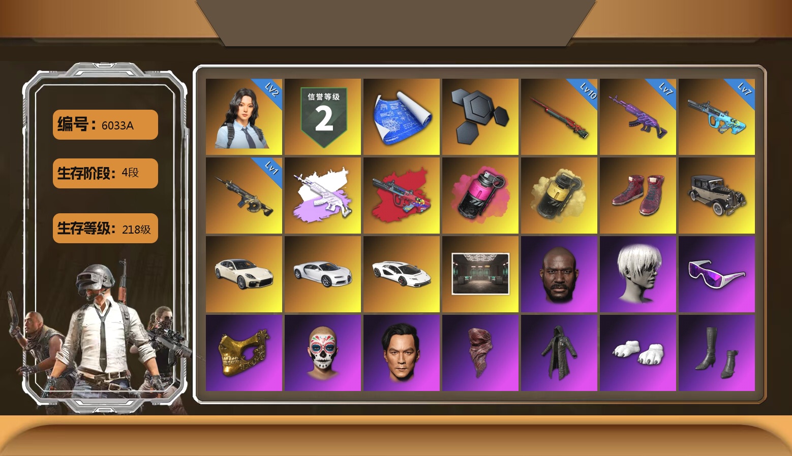 满级青龙 6级朱雀 1级火麒麟 1级mk 1级dbs 丑女 金面黑鬼 双马丁 布朗熊 烟雾弹