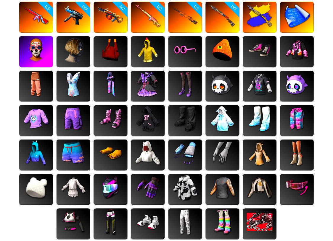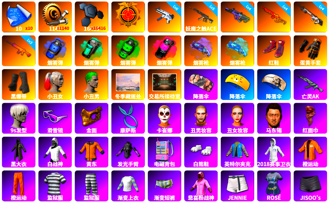 10张图纸 蜗牛币 16416聚合物 6级无重力MP5K 5级妖魔之触ACE 4级霓虹AUG 4级圣诞mini 4级赛博MK12 3级南瓜M4 蓝色烟雾弹 青色烟雾弹 翡翠色烟雾弹 品红色烟雾弹 紫色魔法迷雾-M79 蓝色魔法迷雾-M79 柏林鞋 蛋黄手套 黑绷带 小丑女 小丑男 冬季藏匿处 交易所接待室 女团 可可 尼尔 9s发型 滑雪镜 金面 康萨斯 卡崔娜 丑男妆容 马东锡 红面巾 黑大衣 白战神 黄东 发光手臂 电磁背包 白熊鞋 英特尔夹克 橙运动 监狱服 渐变装 粉战神 aespa女团 拉风龙 鸡斯卡夹克 小马尾 丸子头 西游记 脏辫 青海摇 小兔学院 悲喜 滑雪帽 PGC 2021套装 胜利之舞39 枪炮洗礼