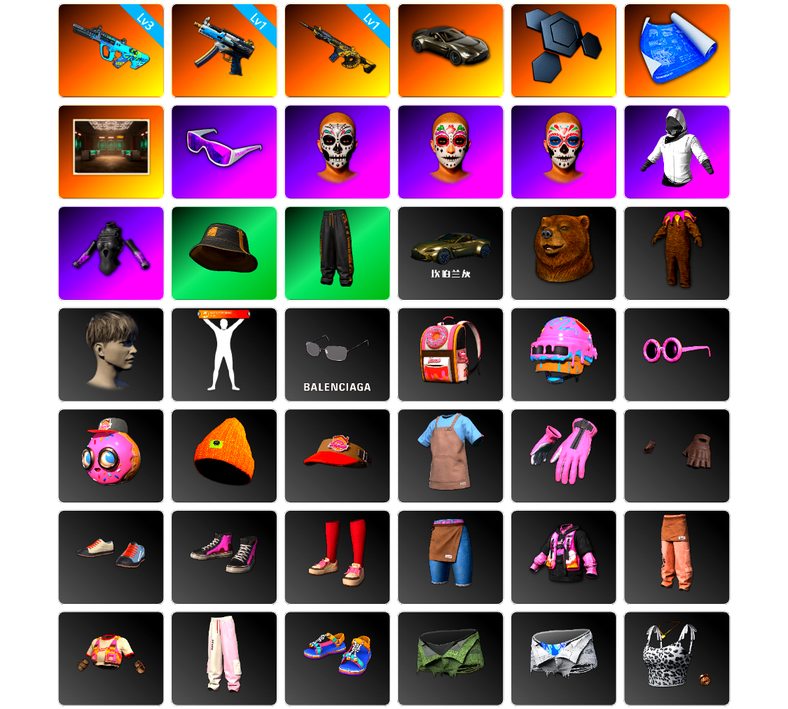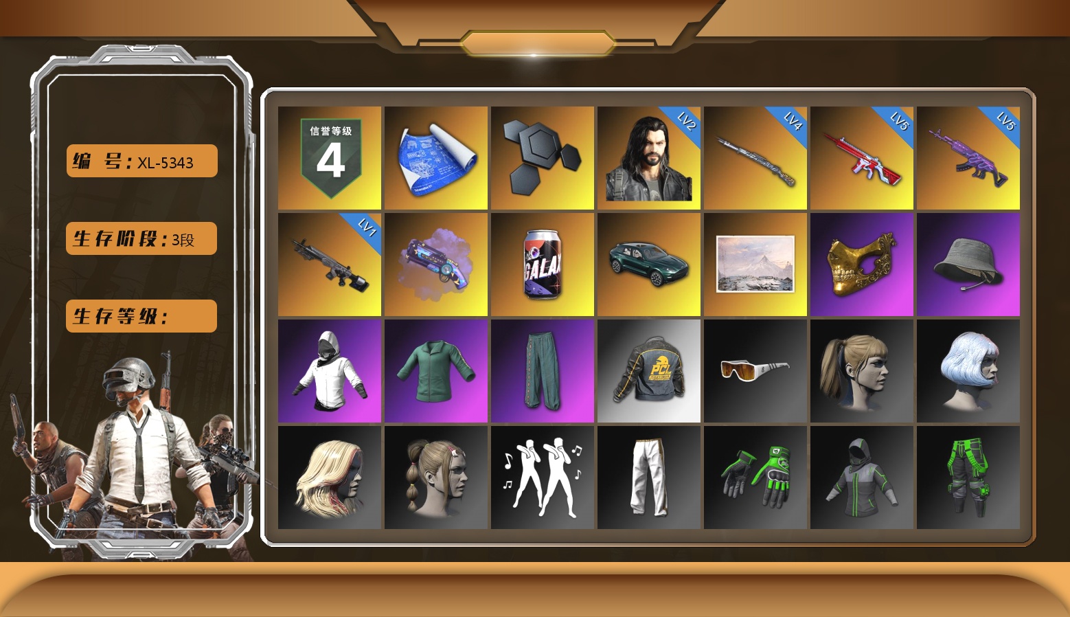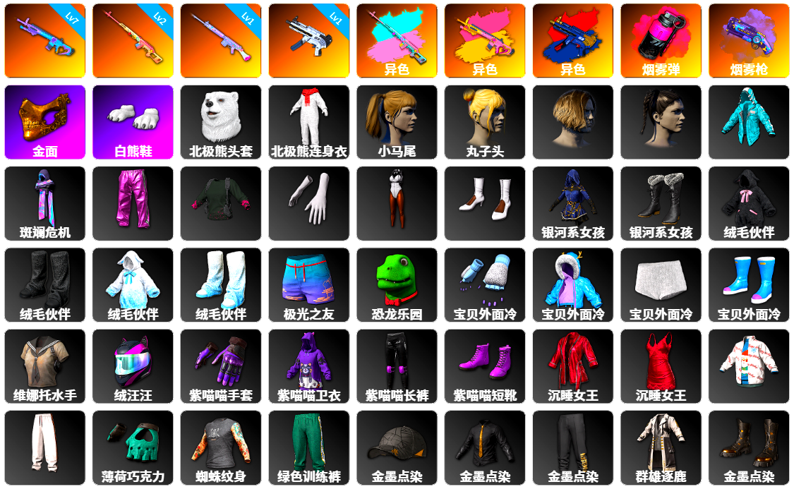 5级无信号M4 5级美杜莎762 4级猛虎98k 2级多利安 1级暗影之主Mk12 紫色魔法迷雾-M79 马丁SUV 冬季藏匿处 3张图纸 5785聚合物 金面 渔夫帽 白战神 活动绿东 萨芬裤 滑雪帽 小马尾 青海摇 绷带AK 西游记 胜利之舞39