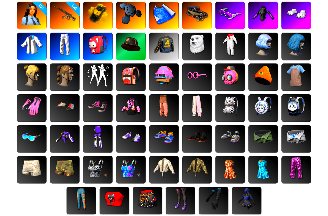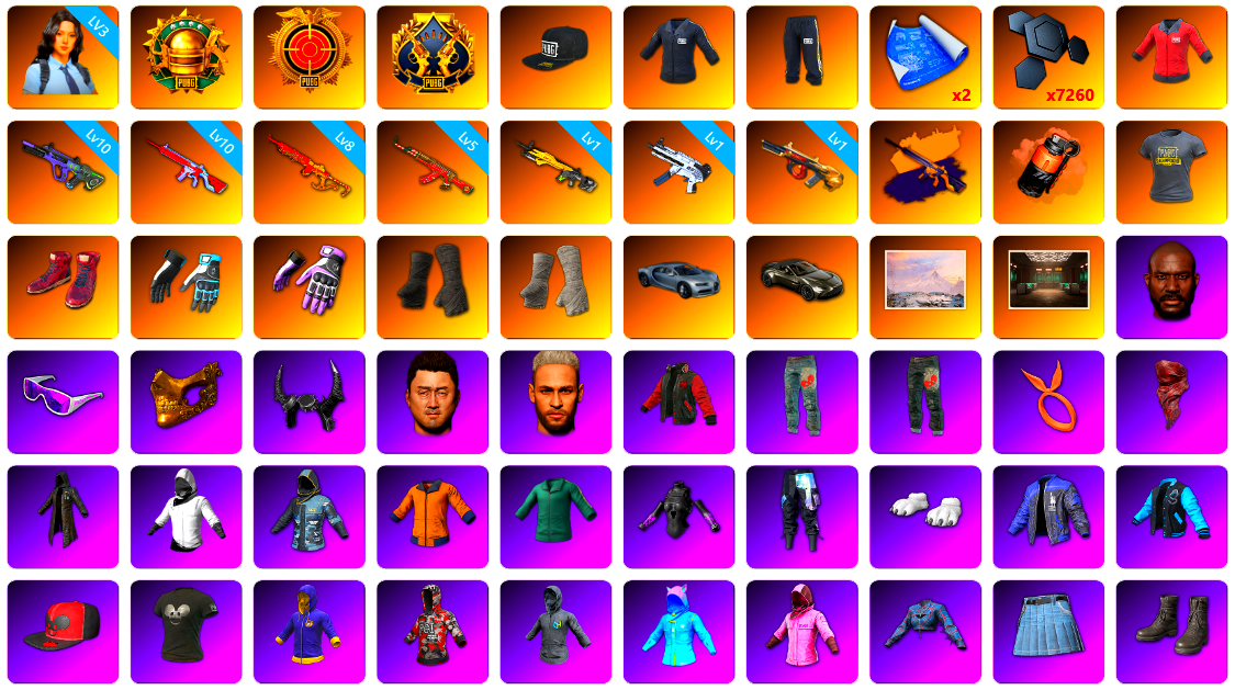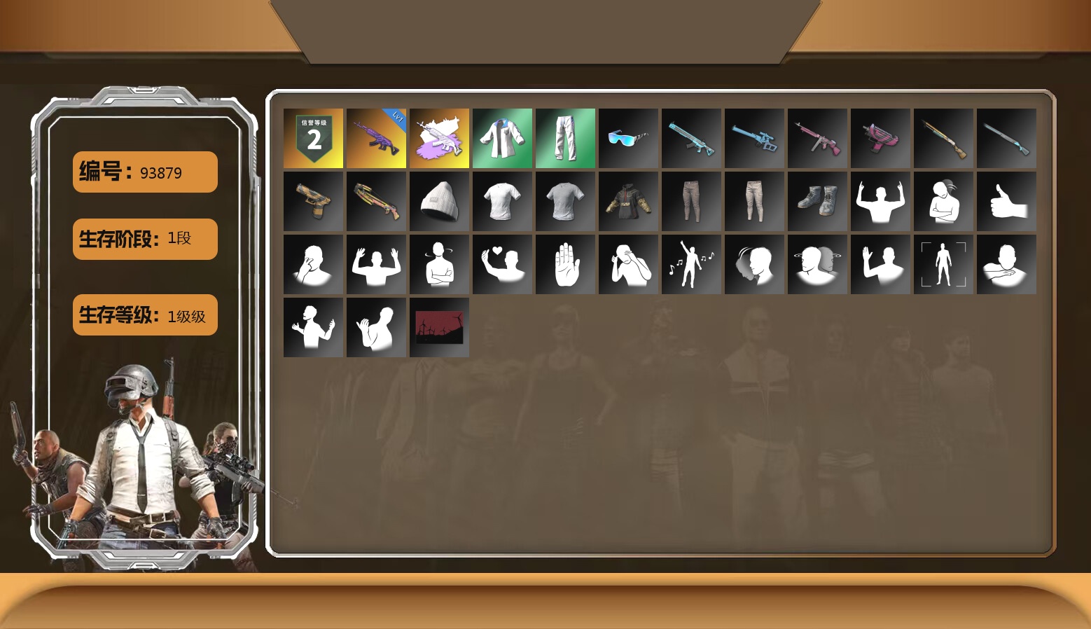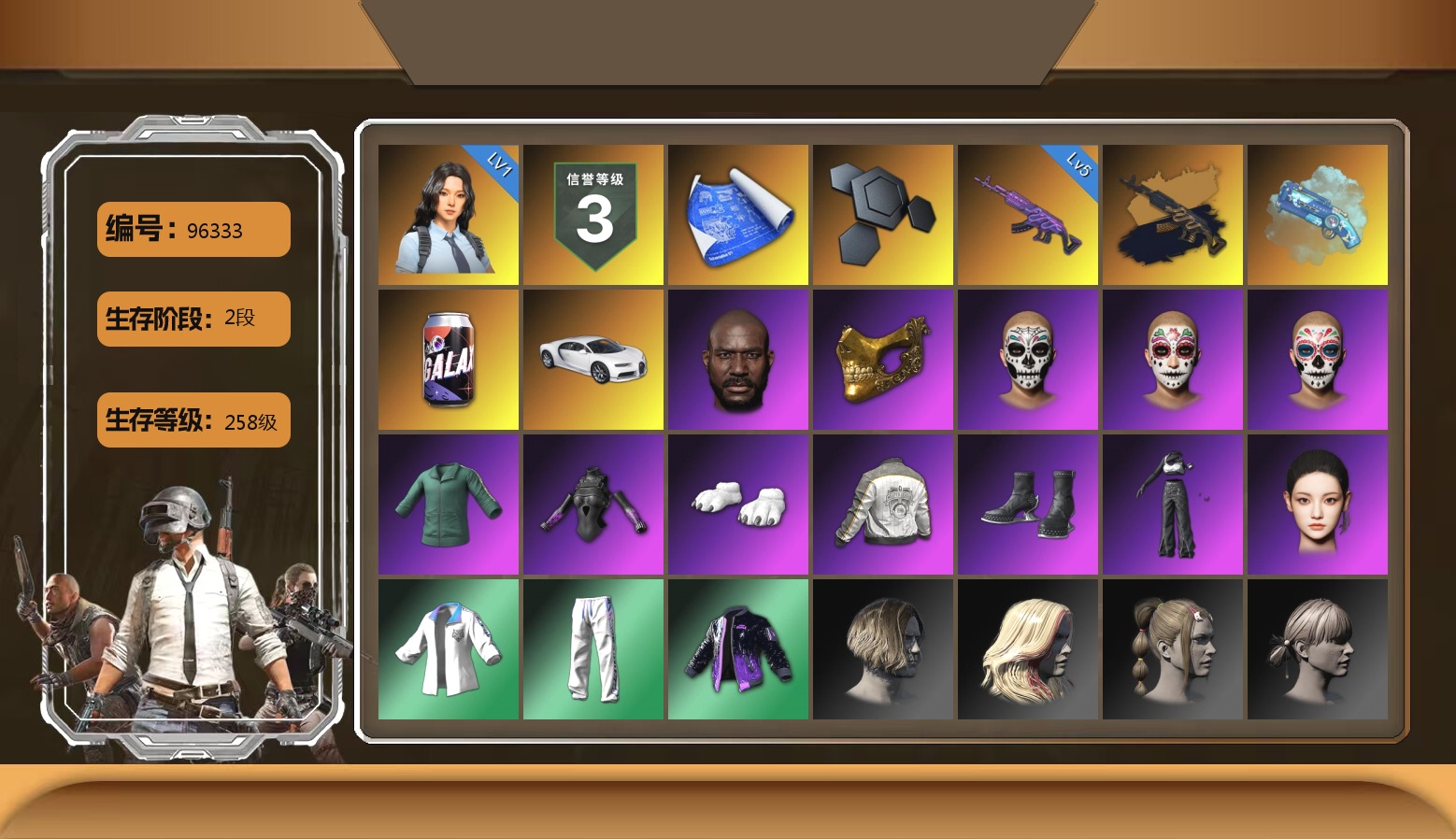 7张图纸 4000聚合物 今晚吃鸡金 千钧一发金 神枪手金 10级孙悟空M24 9级青龙762 6级猪八戒M4 6级刻耳柏洛斯M249 2级唐三藏平底锅 青龙762(异色) 孙悟空M24(异色) 唐三藏(异色) 蓝色烟雾弹 珊瑚色烟雾弹 青色烟雾弹 橙色狂怒之雾-M79 小丑男 小黑盒 马丁敞篷跑车 马丁SUV 陈列室 交易所接待室 武器神龛 丑男妆容 黑鬼 滑雪镜 牛角 金面 黑绷带 柏林鞋 红面巾 黑大衣 小战神 发光手臂 白熊鞋 萨芬裤 粉战神 阿狸 小黄鸭 拉风龙 (奢华版)科米特绿 车漆 小马尾 丸子头 西游记 青海摇 小兔学院 悲喜 PGC 2021套装
