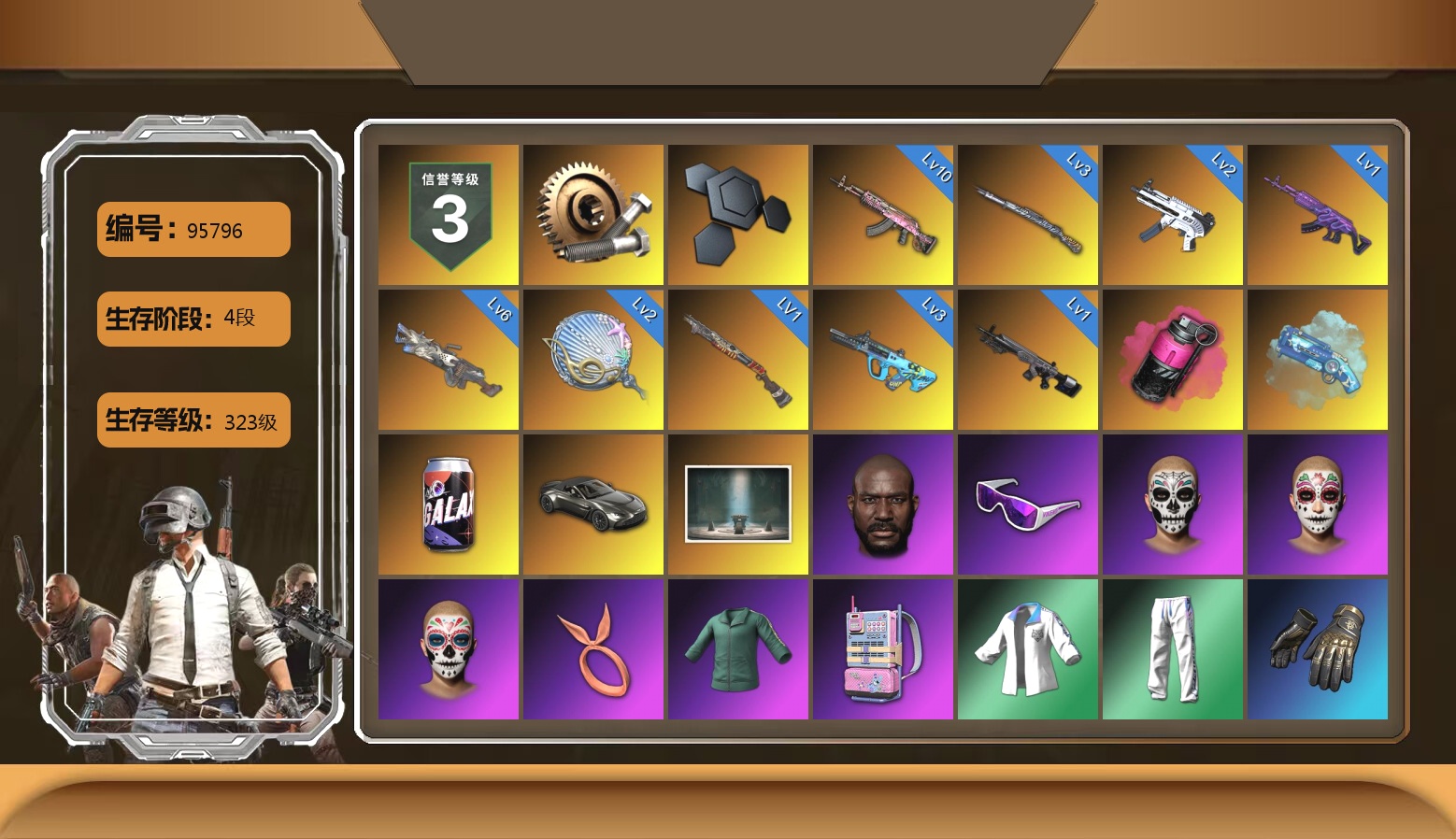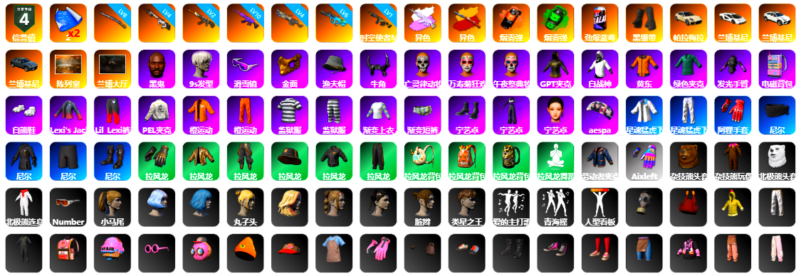 10级火麒麟 6级刻耳柏洛斯M249 3级GD-AUG 3级猛虎98k 2级无重力MP5K 2级塞壬平底锅 1级美杜莎762 1级烈日灼烧-S1897 1级暗影之主Mk12 品红色烟雾弹 蓝色魔法迷雾-M79 蜗牛币 7619聚合物 马丁跑车 胜利密室 黑鬼 滑雪镜 橙色发带 活动绿东 电磁背包 拉风龙 车漆 小马尾 小绿头 脏辫 小兔学院 PGC 2021套装