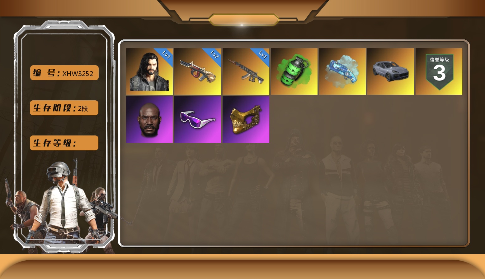 XHW3252 二阶段 信誉三级 【保时捷卡宴】 7-1 7级弥诺陶洛斯 1级妖魔 1级多利安 黑鬼 金面 滑雪镜 黑绷带 绿烟 星魂白运动 大白熊