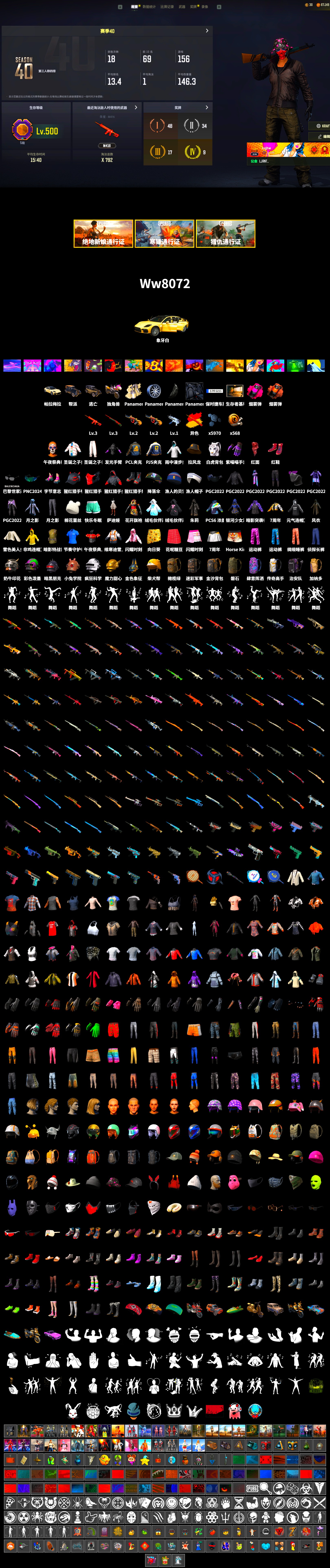 ❤找回包赔❤皮肤:3级朱雀M4 3级孙悟空M24 2级弥诺陶洛斯AUG 1级无重力MP5K 孙悟空M24(异色) 珊瑚色烟雾弹 品红色烟雾弹 柏林鞋 帕拉梅拉 信誉等级零 5970聚合物 午夜祭典妆容 红面巾 黑大衣 发光手臂 白虎背包 拉风龙 PJS夹克 PCL夹克 红丝绒兔耳 发型21 火鸡帽子 非鸡连帽卫衣 斑斓危机 闪亮运动裤 紫色运动裤 战术科技裤 特工小兔长袖上衣 特工小兔长裤 银河系女孩 银河系女孩 棉花糖帽子 棉花糖鞋 维娜托水手 棉花蕾丝绒 绒汪汪 紫喵喵手套 紫喵喵卫衣 紫喵喵长裤 紫喵喵短靴 奶牛印花绑结式上衣(棕色) 奶牛印花绑结式上衣(黑色) 维寒迪雪上运动夹克 维寒迪长裤 先驱战队 先驱战队 先驱战队 先驱战队 先驱战队 先驱战队 绸缎睡裤 战术科技夹克 OGBG 纹身 金墨点染 金墨点染 萨莉3级头 小兔航天局 小兔学院 兔兔也朋克腿套 神秘女巫 粗糙 (橙色) - M416 雪国风光 - M416 蟒蛇花园 - M416 彩糖蛋糕 - M416 青龙 朱雀 万圣之夜 大猫狂怒 把钱交出来 今夜,将一切带走 PGC 2022 王牌登场 - Beryl M762 亲爱的,看锅! 山花烂漫 - Beryl M762 魔女之力 - Beryl M762 花呢控 - Beryl M762 梅花同花 - Beryl M762 毒性 - Beryl M762 灵魂枷锁 - AKM 镀金 - AKM 蟒蛇花园 - AKM 大理石宝藏 - AKM 银河武装 - AKM 金色落叶 - AKM 竞速之道 - AKM 多彩科技猫 - AUG 镀银 - AUG 糖果碗 - ACE32 大理石宝藏 - ACE32 分形碎片 - ACE32 疯狂收割者 - SCAR-L 火山灰烬 - SCAR-L 粗糙 (橙色) - SCAR-L 三重彩 - SCAR-L 双色 - M16A4 冷血 - M16A4 恶战 - M16A4 华夫饼 - M16A4 皇家舰队 - M16A4 圆点猎手 - M16A4 游猎之旅 - M16A4 甜蜜外衣 - M16A4 鎏金王朝 - QBZ 分秒必争 - QBZ 这不是玩具 - Mk47 Mutant 双色 - Mk47 Mutant 无尽迷宫 - Mk47 Mutant 奥丁的先锋 - Mk47 Mutant 金色落叶 - Mk47 Mutant 灵魂枷锁 - Mk47 Mutant 淡雅之力 - Mk47 Mutant 水手 - G36C 标准猎手 - G36C 分形几何 - G36C 无尽迷宫 - Groza 方形铬印 - Groza 镀金 - Groza 钴蓝呼号 - K2 雪花 - K2 无慈悲 - K2 皇家舰队 - K2 无拘来世 - K2 钴蓝呼号 - SLR 大理石宝藏 - SLR PGC 2022 王牌登场 - SLR 水手 - SLR 彩虹之上 - SLR 分形几何 - SKS 镀金 - SKS 数码丛林迷彩 - SKS 金色落叶 - SKS 部落猛禽 - SKS 幸运骑士 - SKS 皇家舰队 - Mini14 甜蜜外衣 - Mini14 数码沙漠迷彩 - Mini14 礼物环绕 - Mini14 拼图 - Mini14 幽灵之握 - Mk12 红桃同花 - Mk12 雪国风光 - Mk14 孙悟空 - Mk14 镀银 - VSS 海洋哑光(蓝色) - VSS 爬行者之印 - VSS 花呢控 - VSS 疯狂收割者 - QBU 鎏金王朝 - QBU 这个夜晚不太静 - 德拉贡诺夫 拼图 - Win94 镀金 - Win94 数码沙漠迷彩 - Win94 悠扬情歌 - Kar98k 数码沙漠迷彩 - Kar98k 恐怖滤镜 - Kar98k 无慈悲 - Kar98k 粗糙 (橙色) - Kar98k 朱莉的Kar98k 猪八戒 - AWM 鲜花之力 - AWM 镀金 - AWM 海藻在路上 - M24 疯狂收割者 - M24 幽灵之握 - M24 幸运骑士 - M24 恶战 - 莫辛纳甘步枪 海洋哑光(蓝色) - 莫辛纳甘步枪 王牌 - 莫辛纳甘步枪 海兽 - 莫辛纳甘步枪 双色 - 莫辛纳甘步枪 无拘来世 - 莫辛纳甘步枪 灰色系 - MP5K 标准猎手 - MP5K 疯狂收割者 - MP5K 雪花 - MP5K 双色 - MP5K 海洋哑光(绿色) - MP5K 唐三藏 - FAMAS 竞速之道 - P90 Poof! - PP-19 Bizon 沙漠烈阳 - PP-19 Bizon 方形铬印 - PP-19 Bizon 镀金 - UMP 彩虹之上 - UMP 竞速之道 - UMP 熔岩灯 - UMP 镀银 - UMP 回收再利用 - UMP 标准猎手 - UMP 粗糙 (橙色) - UMP 辉煌 - UMP 海藻来帮忙 - UMP 游猎之旅 - UMP 拼图 - 汤姆逊冲锋枪 愉悦的绿松色 - 汤姆逊冲锋枪 水手 - 汤姆逊冲锋枪 回收再利用 - 汤姆逊冲锋枪 雪国风光 - 汤姆逊冲锋枪 镀银 - 汤姆逊冲锋枪 银河武装 - MP9 灵魂枷锁 - Vector 圣诞之力 - DP-28 镀金 - Vector 海洋哑光(绿色) - Vector 三重彩 - Micro UZI 数码沙漠迷彩 - Micro UZI 锁链帮 - Micro UZI 水手 - Micro UZI 淡雅之力 - Micro UZI 无信号 - Micro UZI 冲锋枪 午餐肉 - M249 花呢控 - M249 无拘来世 - DP-28 三重条纹 - DP-28 陶土质感 - DP-28 游猎之旅 - DP-28 雪花 - DP-28 幽灵之握 - DBS 灰色系 - DBS 海藻自己上 - O12 朱雀之灵 - O12 镀金 - 锯短型霰弹枪 数码沙漠迷彩 - 锯短型霰弹枪 丛林潜行者 - 锯短型霰弹枪 标准猎手 - 锯短型霰弹枪 无尽迷宫 - S12K 镀银 - S12K 波涛荡漾 - S12K 游猎之旅 - S12K 镀银 - S1897 灵长类 - S1897 这不是玩具 - S1897 淡雅之力 - S1897 水手 - S1897 双色 - S686 华夫饼 - S686 波涛荡漾 - S686 海洋哑光(蓝色) - S686 双色 - P92 恶战 - P92 三重彩 - P92 标准猎手 - P92 丛林潜行者 - P92 三重条纹 - 沙漠之鹰 火山灰烬 - 沙漠之鹰 淡雅之力 - R1895 水手 - R1895 愉悦的绿松色 - P1911 沙漠烈阳 - P1911 钴蓝呼号 - P18C 数码沙漠迷彩 - P18C 数码丛林迷彩 - P18C 圣诞之力 - P18C 陶土质感撬棍 三重条纹 - 撬棍 都市猎手 - 十字弩 甜蜜外衣 - 十字弩 双色 - 十字弩 山花烂漫 - 十字弩 标准猎手 - 十字弩 7周年快乐 - 平底锅 高压 - 平底锅 切割狂潮 - 平底锅 8th Anniversary - Pan 海洋独行侠手套 赛博小兔手套 7周年快乐手套 红丝绒生存者手套 人类猎手手套 队长的迷彩手套 准备就绪手套 铁血警官的手套 维寒迪雪上运动手套 恶意侦测者手套 朱莉的手套 窒息的爱袖套 甜蜜梦境手套 寻腥猎犬手套 PGC 2022 战术科技手套 PGC 2022 斑斓危机手套 PGC 2019 护手和智能手表 侦探眼镜 海洋独行侠墨镜 马尔霍特拉的墨镜 远离尘世太阳镜 雪片墨镜 优雅夏日太阳镜 PGC 2022 斑斓危机墨镜 PGC 2019 眼镜 PNC 2024 生存者护目镜 暗夜兔女郎妆容 女性面容22 青年谢尔盖 冬眠后的胡子 发型23 发型42 青年谢尔盖的发型 磐石旅行背