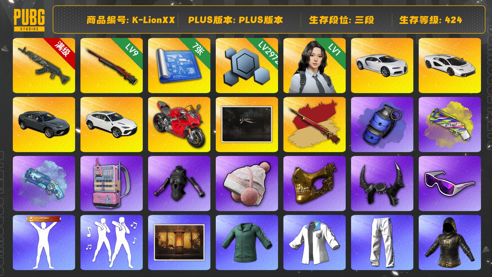 [K-LionXX]10级青龙762,9级孙悟空M24,1级瀚娜,兰博SUV,布加迪威龙,兰博大厅,兰博跑车,孙悟空M24异色,兰博奢华SUV,杜卡迪红,布加迪普通跑车,兰博基尼,杜卡迪,金面,黄色狂怒之雾 - M79,蓝色烟雾弹,滑雪镜,渔夫帽,牛角,发光手臂,蓝色魔法迷雾 - M79,烟雾弹,烟枪,星魂虎虎生威大礼包,青海摇,小绿东,白战神,武器神龛,电磁包,拉风龙套装,人型看板,小马尾,丸子头