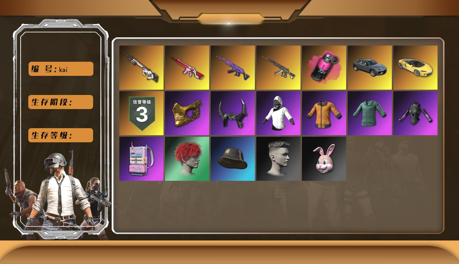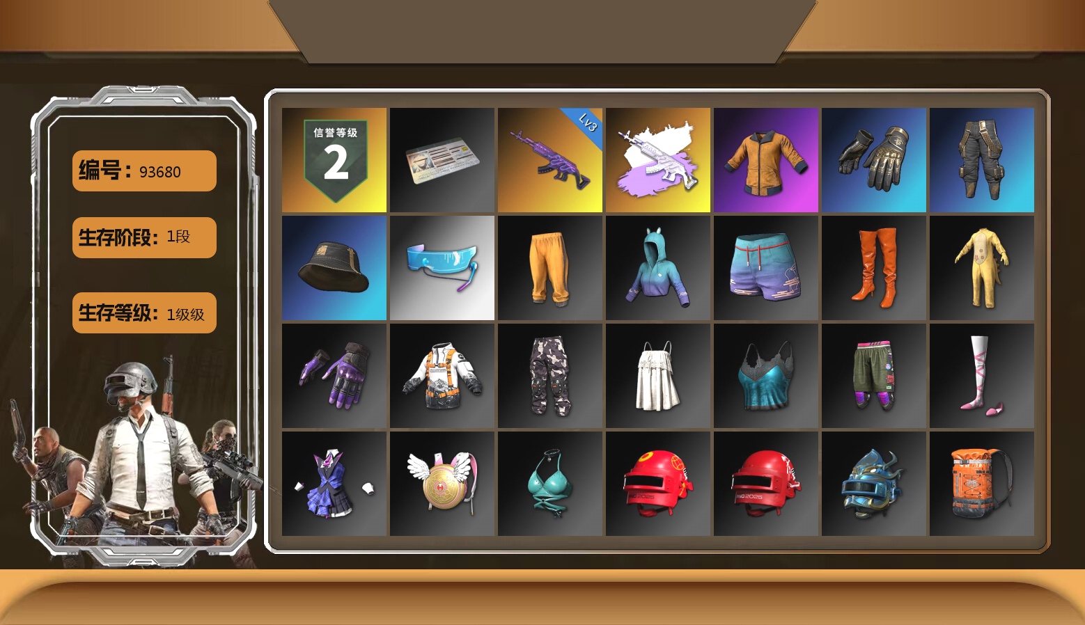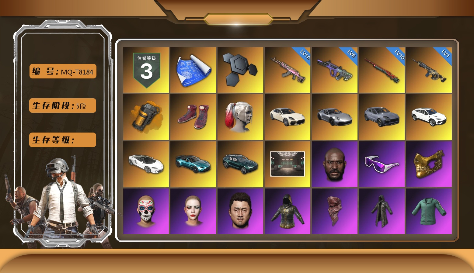 10级火麒麟 10级孙悟空M24 6级霓虹AUG 1级时空使者M4 橘色烟雾弹 柏林鞋 小丑女 帕拉梅拉 保时捷911 保时捷卡宴 兰博基尼SUV 迈凯伦硅质白版 马丁敞篷跑车 马丁SUV 交易所接待室 1张图纸 1394聚合物 黑鬼 滑雪镜 金面 马东锡 红面巾 黑大衣 活动绿东 发光手臂 白熊鞋 小马尾 丸子头 脏辫 青海摇 小兔学院 绷带AK 西游记 胜利之舞39