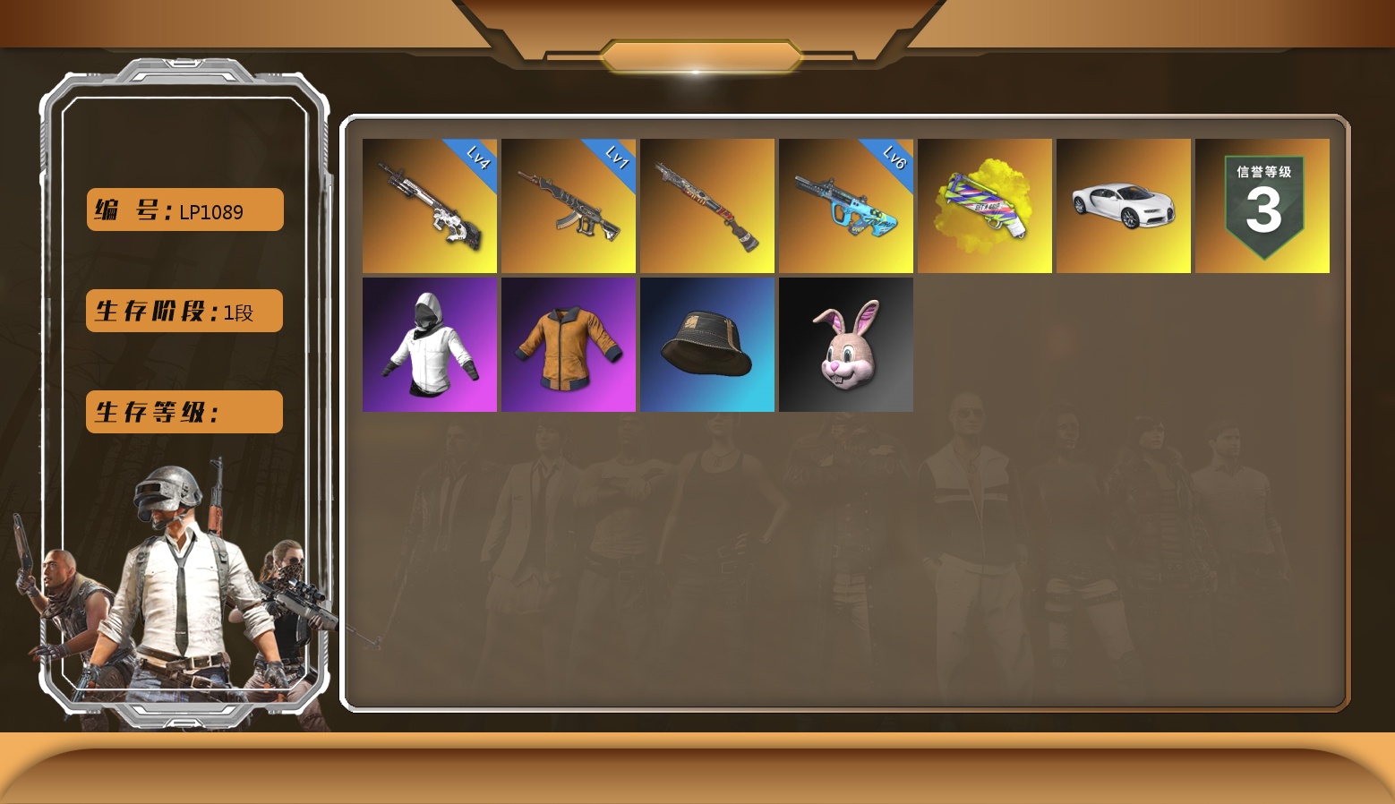 335生存等级,布加迪,6级权志龙AUG,4级赛博MK12,1级妖魔ACE,1级烈日喷子,彩烟枪,星魂虎套装,白战神,拉风龙套装,黄东南亚,小兔学院