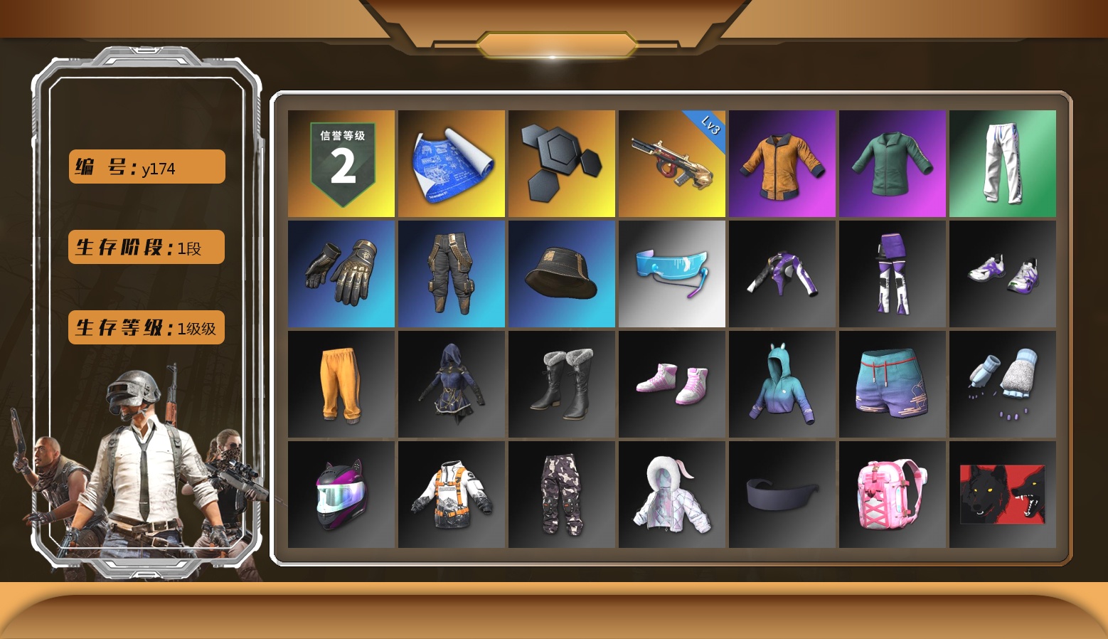 火麒麟 齿轮炮 朱雀M4 玄武SKS 白虎锅 霓虹AUG 小兔MK12 小丑女 小丑男 黑鬼 马东锡 金面 大魔王 烟雾弹 生存等级 三阶段 电磁背包 跑车 SUV 信誉等级 信誉等级三 牛角 小兔学院 悲喜 9级 6级 1级 2级 是否可排位 是 瀚娜