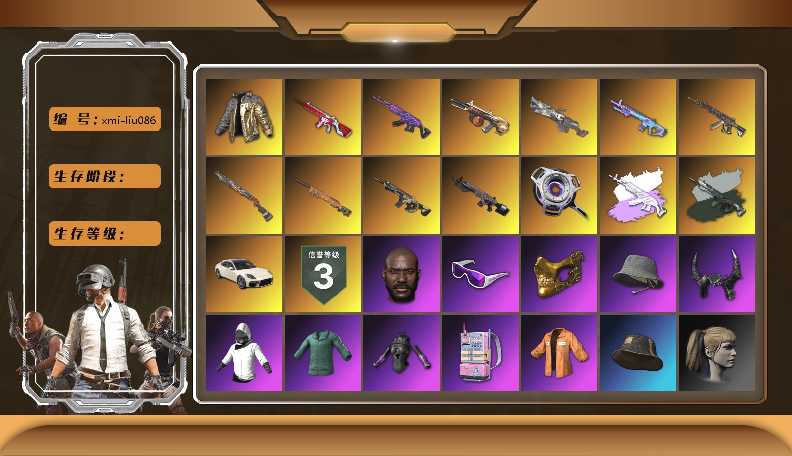 3阶段 小马尾 粉头 滑雪镜 金面 渔夫帽 黑鬼 电磁背包 发光手臂 黑盒手套 小战神 杜卡迪 8成长 满级火麒麟 齿轮炮