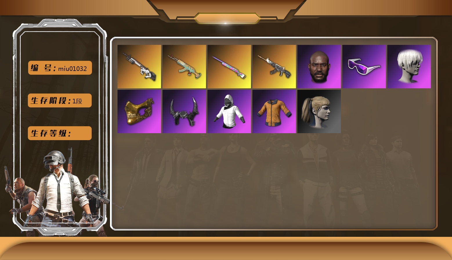 免费版 2级恶魔ACE 2级爆裂AUG 2级无信号M4 2级弥诺陶洛斯AUG 1级无重力MP5K 1级时光加农SKS 橙色狂怒之雾-M79 黑绷带 交易所接待室 白战神 黄东 发光手臂 白熊鞋 拉风龙 青海摇 小兔学院