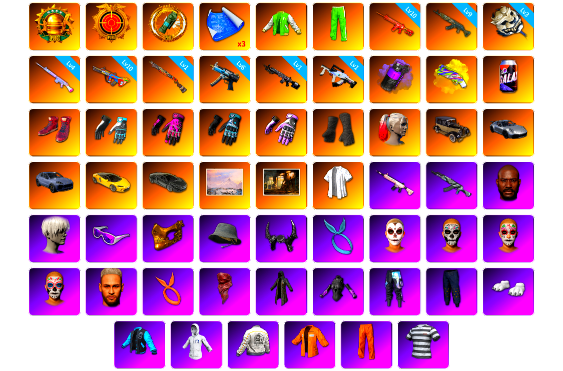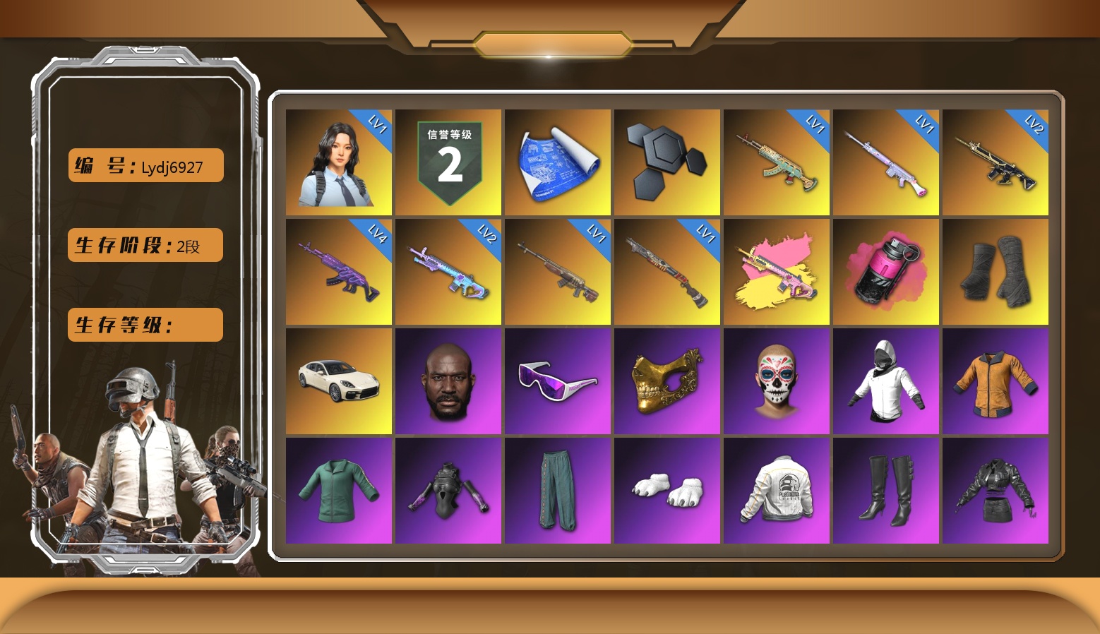 3张图纸 显卡套 10级朱雀M4 9级青龙762 3级白虎锅 4级玩偶炮 10级爆裂AUG 1级烈日灼烧-S1897 6级寒蚀MP5K 1级暗影之主Mk12 1级冰域Groza 紫色烟雾弹 黄色狂怒之雾-M79 柏林鞋 大魔王 迈阿密 小兔手套 小黑盒 黑绷带 小丑女 保时捷911 保时捷卡宴 跑车 迈凯伦玛瑙黑版 冬季藏匿处 粉猪M4 黑鬼 9s发型 滑雪镜 金面 渔夫帽 牛角 康萨斯 卡崔娜 内马尔 橙色发带 红面巾 黑大衣 发光手臂 竞猜裤 明月裤 白熊鞋 橙运动 监狱服 渐变装 小黄鸭 尼尔 布朗熊 拉风龙 鸡斯卡夹克 车漆 小马尾 粉头 丸子头 西游记 脏辫 青海摇 小兔学院 悲喜 滑雪帽 胜利之舞39 枪炮洗礼
